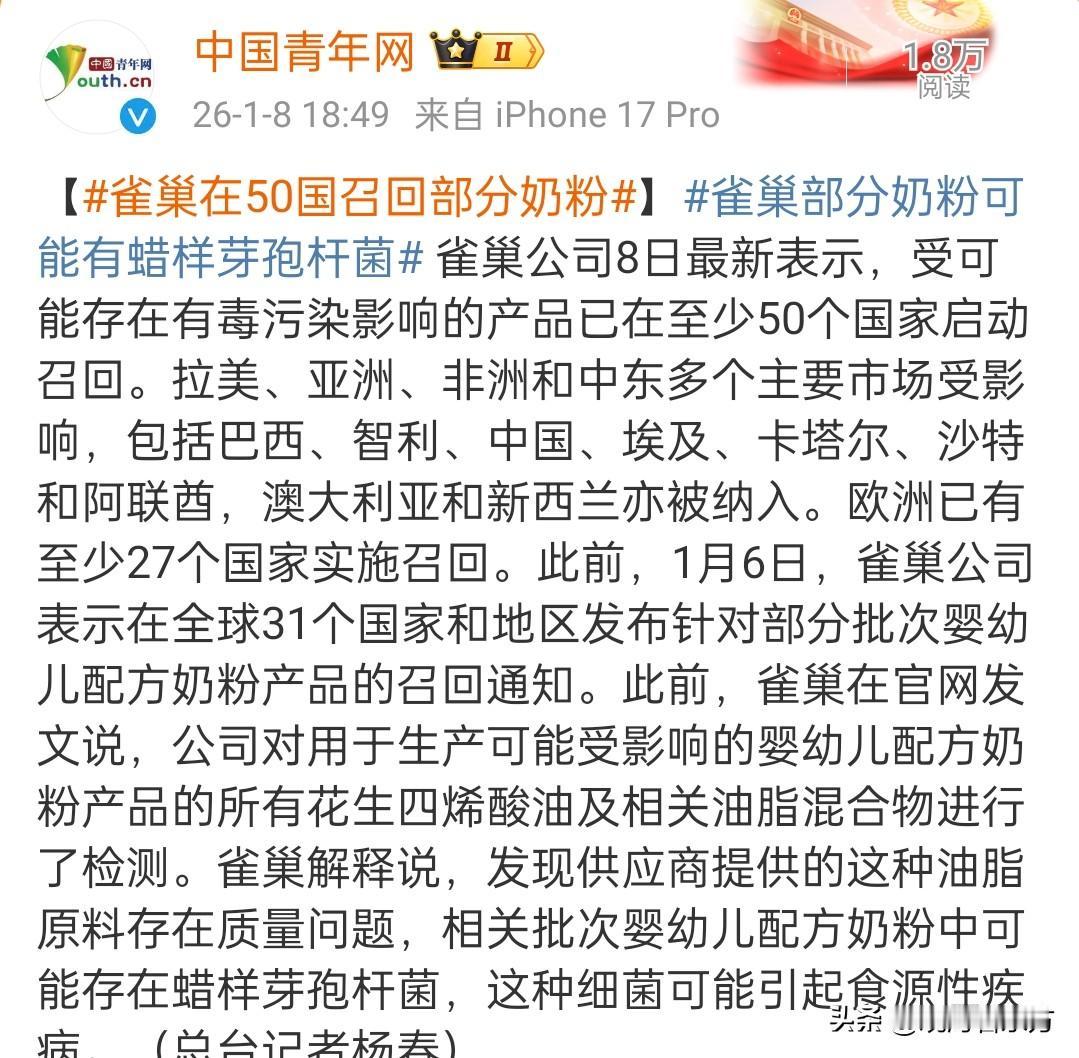 雀巢宣布召回婴幼儿奶粉,配方奶粉中存在蜡样芽孢杆菌,包括中国。
