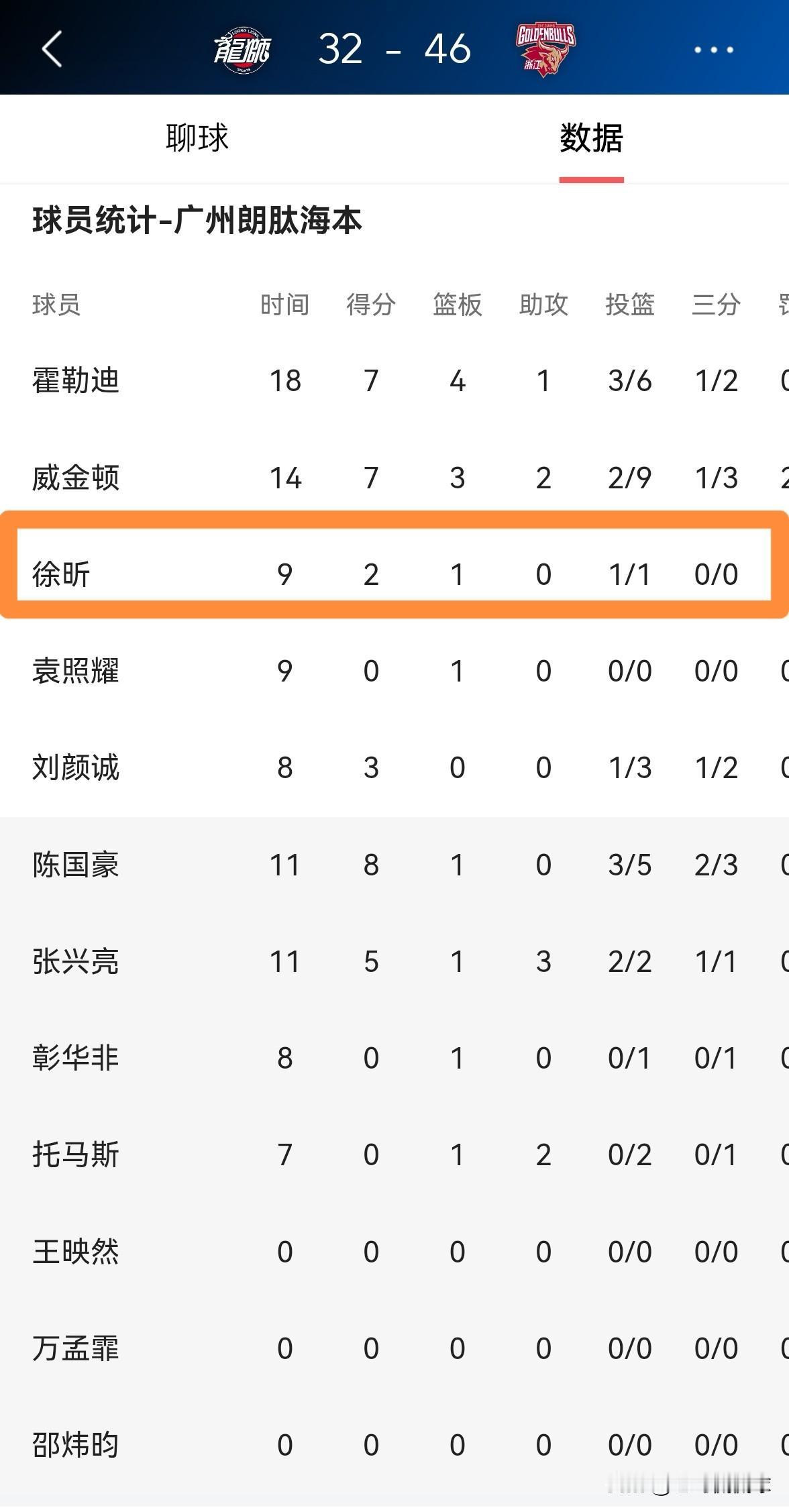 广州朗肽海本新星徐昕真是毫无斗志!在今天广州朗肽海本主场迎战浙江稠州金租的比赛中,目前双方半场战罢,广州朗肽海本以32:46落后于对手。让人感到非常失望的是,在前两节比赛中,徐昕仿佛没有睡醒一样毫无斗志,他在首发出战的9分钟里,投篮1中1仅仅得到2分1篮板,他的场上正负值为-17。 如果徐昕在下半场比赛中依然继续低迷的话,那么广州朗肽海本很有可能会惨败于浙江稠州金租,此时此刻我强烈建议徐昕赶紧醒醒吧。