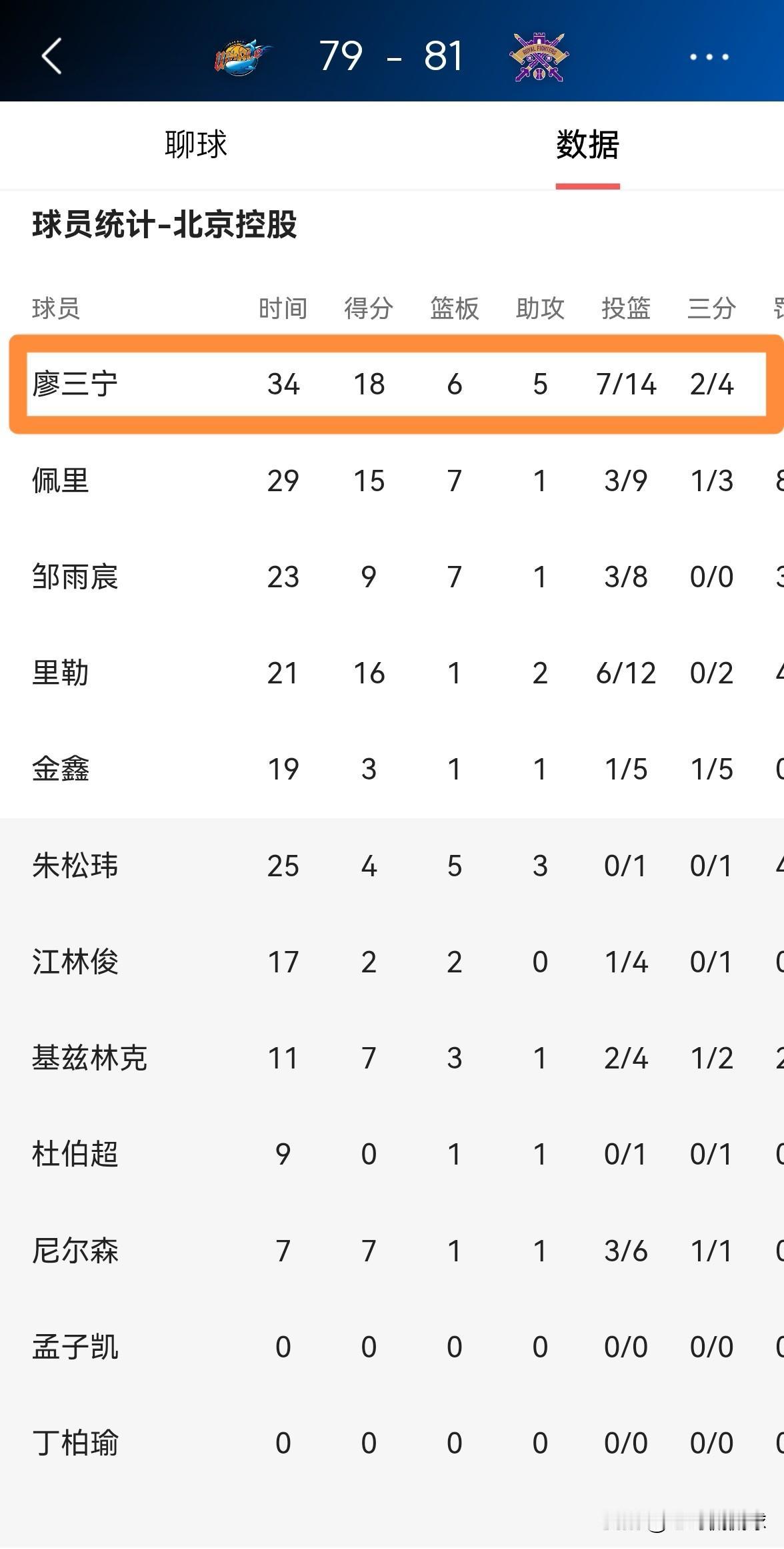 我忍不住要怒赞北京控股当家控卫廖三宁!在今天北京控股客场以81:79险胜四川丰谷酒业的比赛中,廖三宁展现出了一名国字号控卫的风采。 全场比赛下来,廖三宁首发出战34分钟,投篮14中7,其中三分球4中2、罚球2中2非常高效的砍下18分6篮板5助攻,仅仅出现了1次失误,他的场上正负值为+2。 本场比赛廖三宁在个人得分和组织进攻两方面的表现都非常出色,希望他能够在接下来的比赛中延续这样的出色表现,早日将球队带出泥潭。