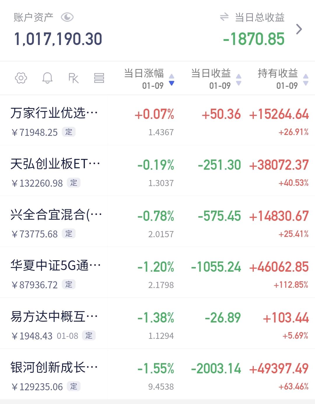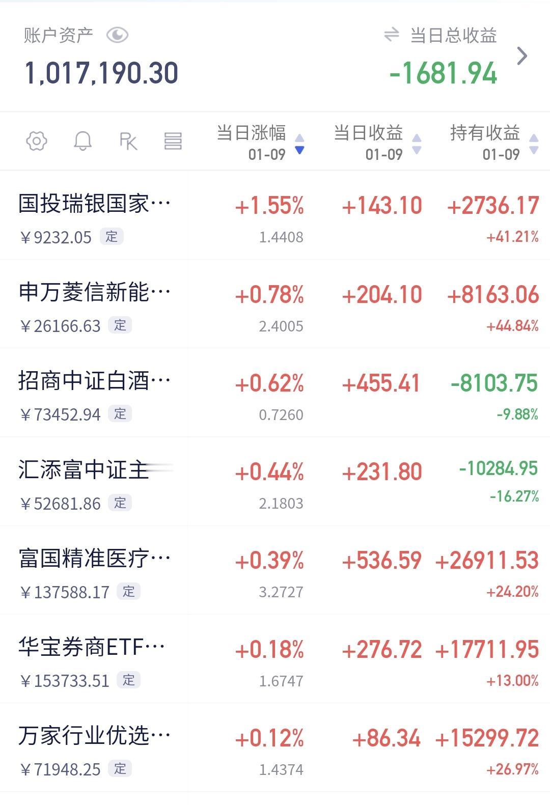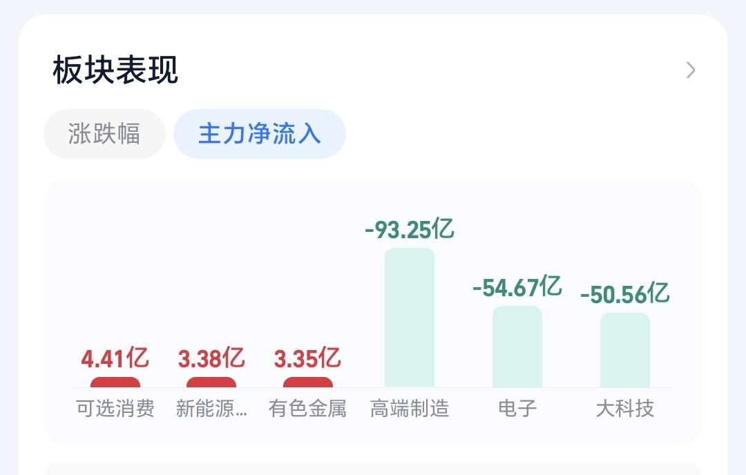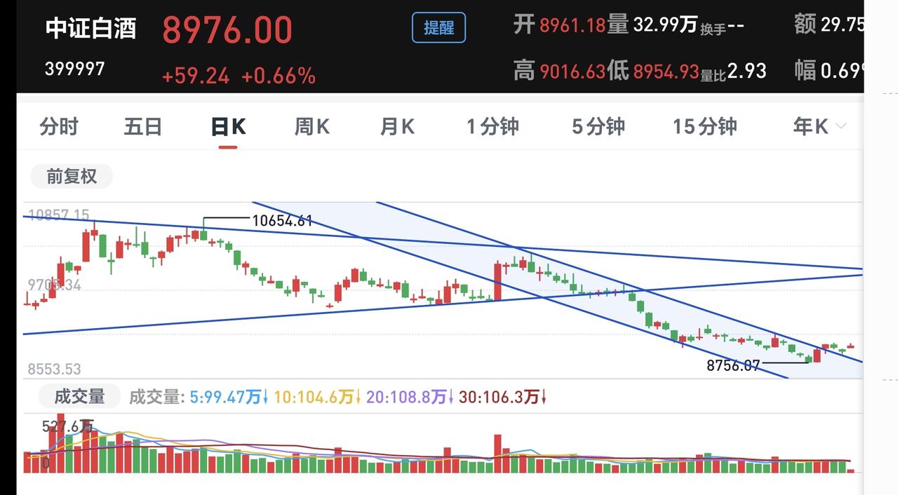 基金:白酒板块短期下跌趋势有可能已经被改变 今天市场开盘涨跌不一,创业板指和深成指低开,上证指数高开,创业板指开盘下跌了0.69%,开于3279点,上证指数开盘上涨了0.09%,开于4086点。 开盘以后指数小幅度震荡,黄色线在蓝色线上方,两条线之间的敞口比较大,只要在两条线位置不变化,今天的盘面就不会有大问题。 现在两市累计成交6674亿,相比于昨天同期放量了11%,成交量放大的幅度还可以,但市场指数上涨的幅度不大,有放量滞涨的嫌疑,也就是成交量的放大幅度与市场指数的上涨幅度不相匹配,需要继续观察,保持谨慎的态度,成交量这样的放量幅度,对应的指数应该是站在4100点上方。 我们来看一下下面的截图6,这是主力资金进出板块的情况,主力资金净流入最多的三个板块是:可选消费板块,新能源板块,有色金属板块,主力资金净流出最多的三个板块是:高端制造板块,电子板块,大科技板块。 持有的基金中,估值上涨幅度最大的三个板块是:军工板块,新能源汽车板块,白酒板块,下跌幅度最大的三个板块是:芯片半导体板块,5G板块,兴全合宜,估值整体亏损了1870元。 持有的基金中,白酒板块估值是上涨的,现在盘中上涨了0.62%,我们来看一下下面的截图9,这是白酒板块日k线图,从图中可以看出,我画了两条倾斜向下的斜线,这是白酒板块日线级别短期下跌通道,前几天上涨突破了这个下跌通道的上轨。也就是说,白酒板块日线级别短期下跌趋势有可能已经被改变。 我每天都会分享我的观点,我的观点只代表我个人的看法,不能作为你操作的依据,据此操作后果自负。