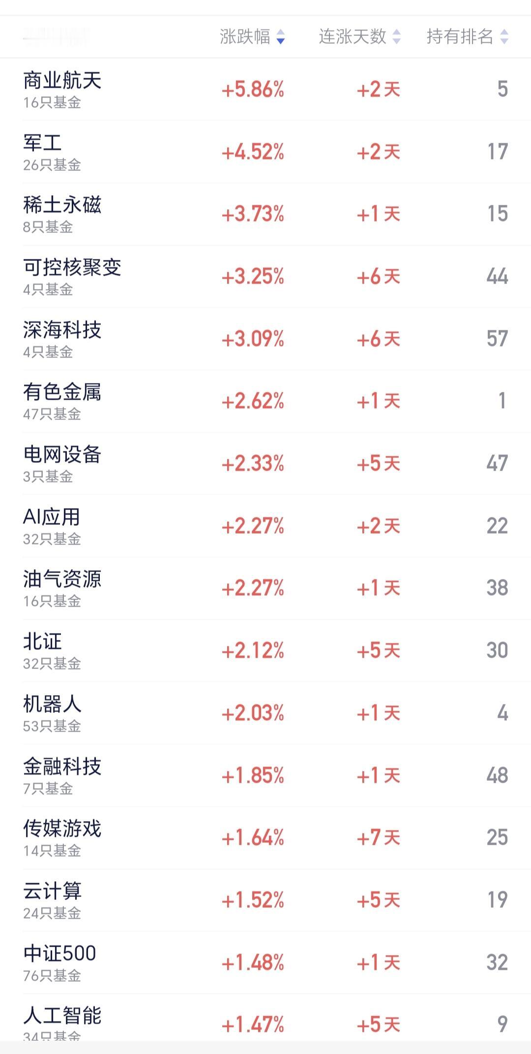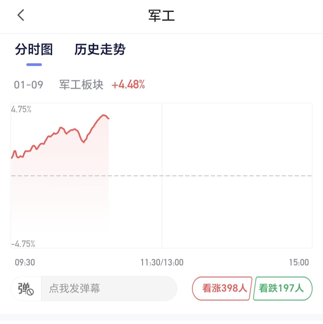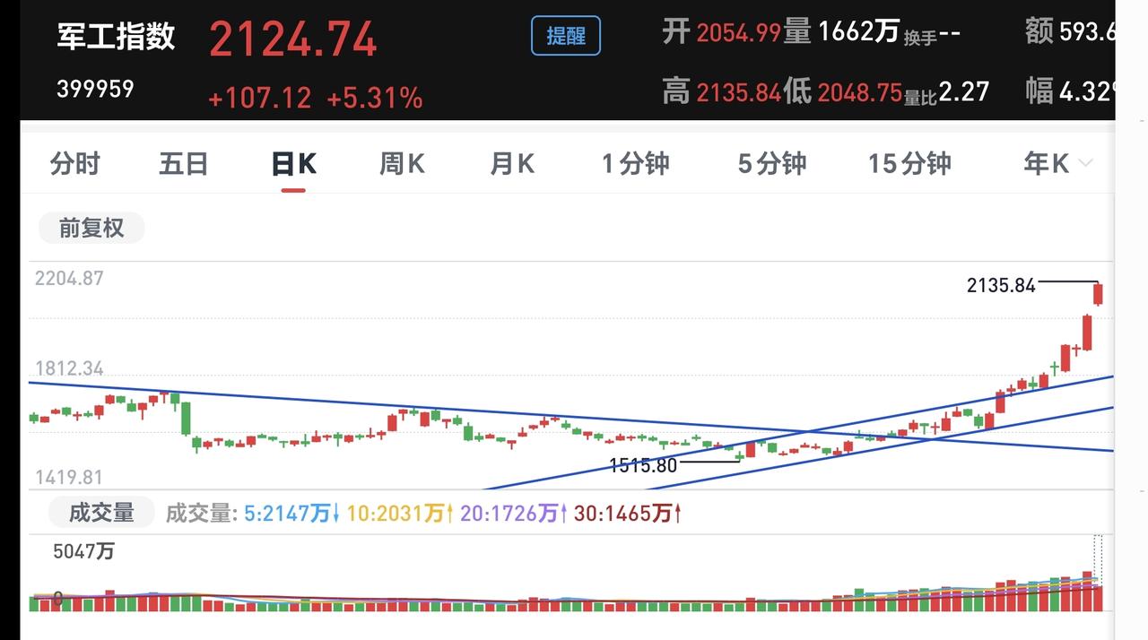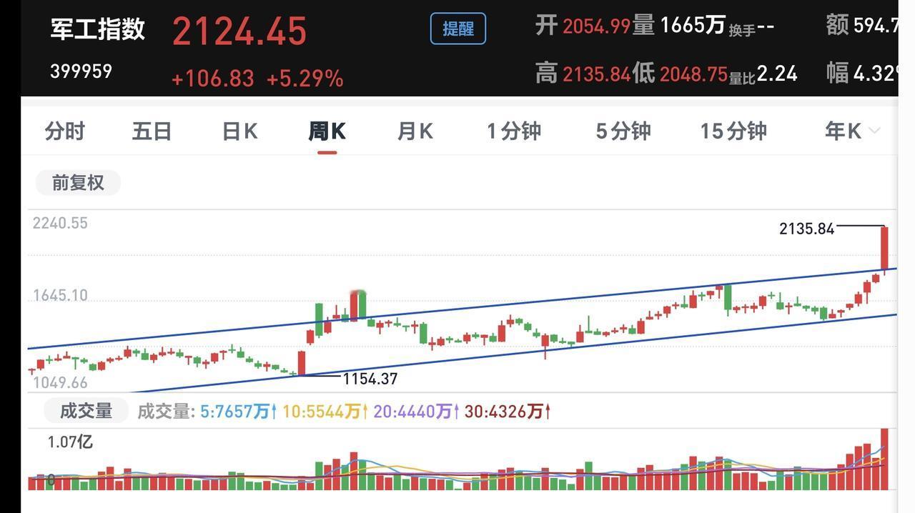 基金:军工板块大涨,现在可不可以进场 市场指数再创新高,点燃了做多的情绪,有人说,风浪越大,鱼越贵,还有人说,撑死胆大的,饿死胆小的,我是半仓看风景,喝茶看戏。 现在盘中上证指数上涨了0.82%,盘中点位4116点,创业板指上涨了0.65%,盘中点位3323点。 现在黄色线还是在蓝色线上方,但两条线之间的敞口没有开盘时候那么大,密切注意两条线位置会不会有变化。 现在两市累计成交16464亿,相比于昨天同期放量了12%,是一个量价齐升的走势,只有这样的走势,才能让人进场,只有这样的走势,才能吸引人进场。 我们来看一下下面的截图6,这是主力资金进出板块的情况,主力资金净流入最多的三个板块是:新能源板块,有色金属板块,稀有金属板块,主力资金净流出最多的三个板块是:电子板块,高端制造板块,5G板块。 今天盘中上涨幅度最大的三个板块是:商业航天板块,军工板块,稀土永磁板块。 军工板块现在盘中估值上涨了4.48%,这个板块今天加仓排行榜见下面的截图9,持有人数排行榜见下面的截图10,加仓人数最多的是安高端装备混合,持有人数最多的是广发中证军工。 我们来看一下下面的截图11,这是军工板块日K线图,从图中可以看出,我画了两条倾斜向上的斜线,这是军工板块日线级别短期上涨通道,前段时间上涨突破了这个上涨通道的上轨,开启了日线级别的加速走势。 我们来看一下下面的截图12,这是军工板块周k线图,从图中可以看出,我画了两条倾斜向上的斜线,这是军工板块周线级别上涨通道,本周的上涨突破了这个上涨通道的上轨,也就是说,军工板块周线级别也有可能再走加速走势。 军工板块日线级别和周线级别都在走加速走势,持有的人可以继续持有,想进场的人谨慎看待。 我每天都会分享我的观点,我的观点只代表我个人的看法,不能作为你操作的依据,据此操作后果自负。
