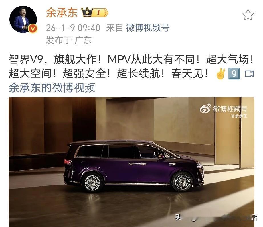 余承东不藏了! 余承东突然官宣鸿蒙智行首款MPV,智界V9视频!余承东直言“MPV从此大有不同”! 余总一口气说出四个“超”:超大气场!超大空间!超强安全!超长续航! 超大空间:3250mm超长轴距远超同级,舱内每一排都宽敞舒适,彻底重塑MPV空间体验; 超大气场:5359mm车长+2009mm车宽,星钻尾灯搭配御风型面设计,商务接待颜值气场双拉满; 超强安全:全维超强车身+气囊数量越级,还搭华为乾崑智驾新一代硬件,安全直接拉满; 超长续航:华为智能增程系统加持,CLTC综合续航超1200km,跨城出行不用愁补能。 余承东被称为地表最强产品经理,去年鸿蒙智行首款旅行车享界S9T旅行车在余总的带领下成了爆款,把旅行车从小众走向潮流。今年蒙智行首款MPV智界V9,你觉得还能成为爆款吗?