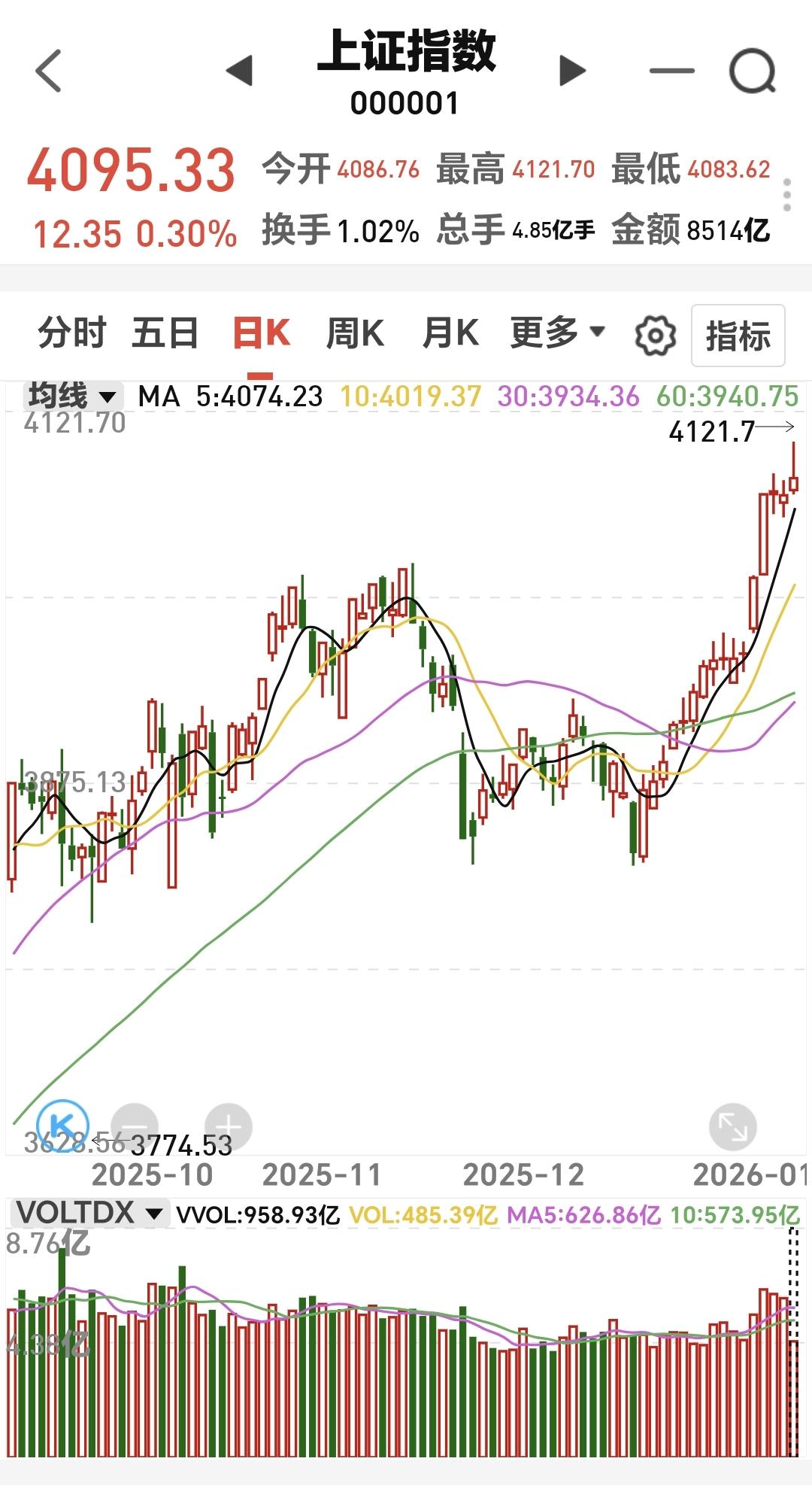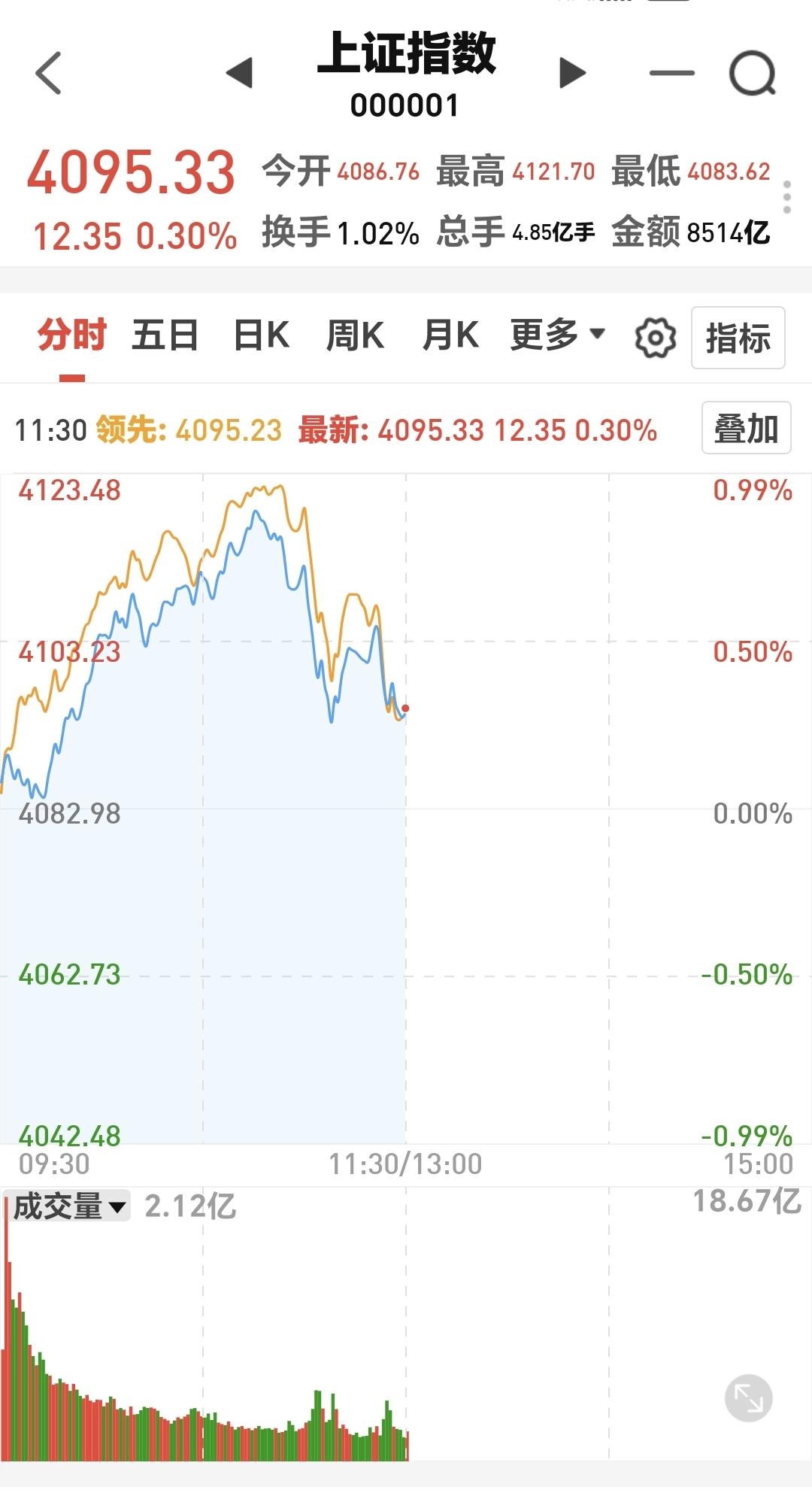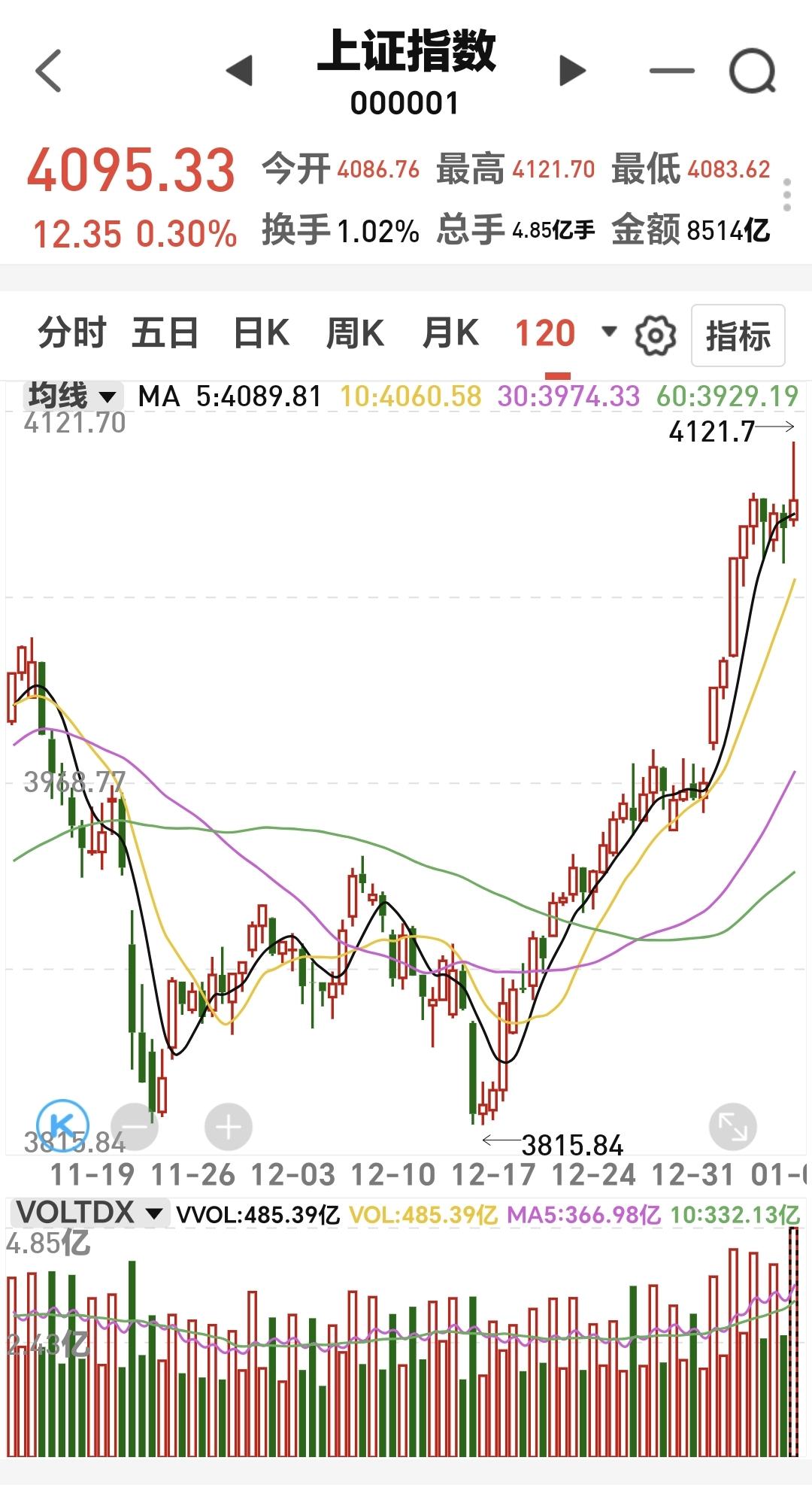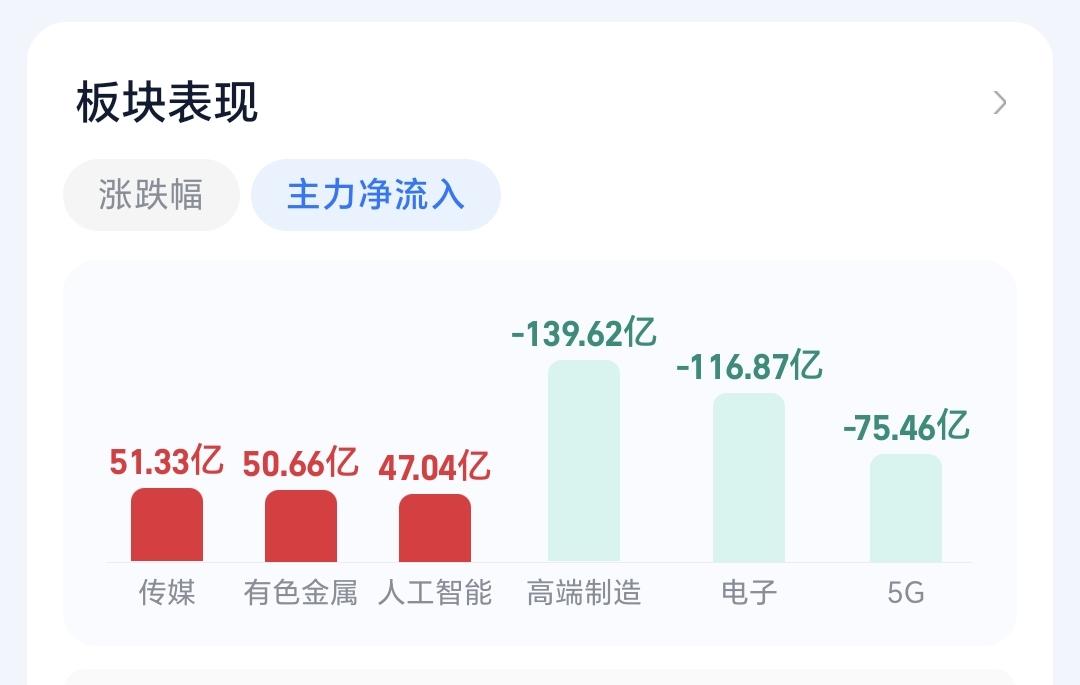 基金:牛市到了哪一个阶段 今天市场冲高回落,中午收盘的时候,三大指数都还是阳线,创业板指上涨了0.10%,收于3305点,上证指数上涨了0.30%,收于4095点。 中午收盘之前,黄色线与蓝色线纠缠在一起,没有能够保持高高在上的状态,下午继续观察这两条线的位置会不会有变化。 上午两市累计成交20614亿,相比于昨天同期放量了17%,今天的成交量会在3万亿以上,成交量到了这个位置之上以后需要谨慎,防止出现天量天价,密切注意会不会有巨量放出。 市场上涨2346家,下跌2938家,上涨的家数少于下跌的家数,涨停65家,跌停2家,主力资金净流出267亿。 我们来看一下下面的截图6,这是主力资金进出板块的情况,主力资金净流入最多的三个板块是:传媒板块,有色金属板块,人工智能板块,主力资金净流出最多的三个板块是:高端制造板块,电子板块,5G板块。 持有的基金中,估值上涨幅度最大的三个板块是:军工板块,新能源汽车板块,先进制造板块,下跌幅度最大的三个板块是:芯片半导体板块,兴全合宜,5G板块,估值整体829元。 现在是处于牛市当中,这是毋庸置疑的,牛市也分为几个阶段: 1:不相信会涨 2:涨到不相信 3:不相信不涨 4:不相信会跌 5:不相信会大跌 市场底部区域的时候,牛市刚刚开始的时候,是不相信会涨的阶段,一直上涨以后,会涨到许多人不敢相信,然后就是许多人不相信市场不会涨,就是更多人不相信市场会跌,认为只要是下跌就是机会,认为只要是下跌就是倒车接人,人声鼎沸的时候,根本没有人相信市场会大跌,你觉得现在的牛市到了哪一个阶段? 今天上午的冲高回落,到中午收盘的时候为止,还没有确定市场已经走弱,下午主要是观察能不能重新站上并站稳4101点,只要能够站上并站稳4101点,就不要过分担心,不排除下午还会再创新高,就是要让更多的人不相信不会涨。 我每天都会分享我的观点,我的观点只代表我个人的看法,不能作为你操作的依据,据此操作后果自负。