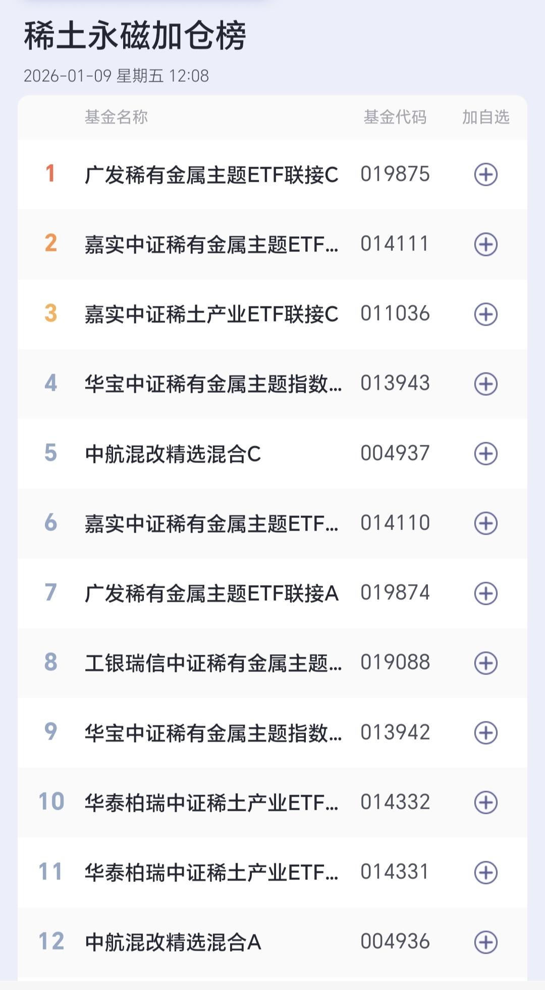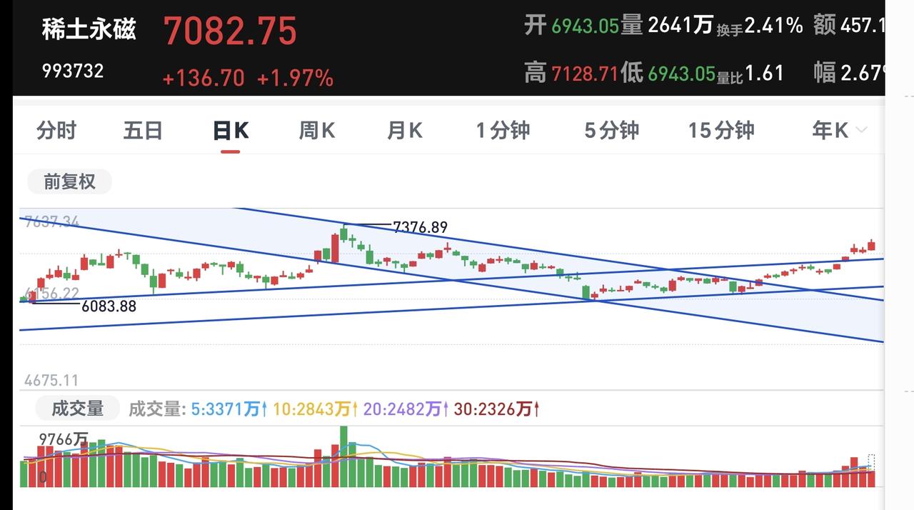 基金:稀土永磁板块大涨,应该怎么办 今天上涨幅度最大的三个板块是:商业航天板块,稀土永磁板块,可控核聚变板块。 稀土永磁板块盘中估值上涨了3.16%,这个板块今天下加仓排行榜见下面的截图3,持有人数排行榜见下面的截图4,加仓人数最多的是广发稀有金属主题,持有人数最多的是嘉实中证稀土产业。 我们来看一下下面的截图5,这是土永磁板块日K线图,从图中可以看出,我画了两条倾斜向上的斜线,这是稀土永磁板块日线级别上涨通道。前几天的上涨突破了这个上涨通道的上轨,也就是说,稀土永磁板块有可能是在走加速的走势。 我们来看一下下面的截图6,这是稀土永磁板块周K线图,从图中可以看出,我画了两条倾斜向上的斜线,这是稀土永磁板块周线级别上涨通道,现在的位置处于这个上涨通道中,也就是说,稀土永磁板块周线级别处于上涨趋势中。 稀土永磁板块日线级别在走加速走势,周线级别处于上涨趋势中,持有这个板块的人可以继续持有,除非跌破上涨通道的下轨,才可以考虑要不要止盈出来观望。 你发现没有,现在许多板块在走加速走势,许多板块的建议都是可以持有,但进场需要谨慎,这说明大盘整体上也是这样的状况。 我每天都会分享我的观点,我的观点只代表我个人的看法,不能作为你超出的依据,据此操作后果自负。