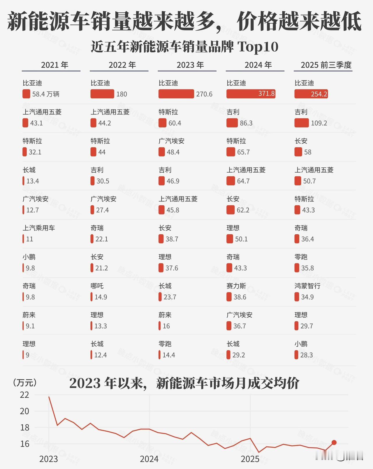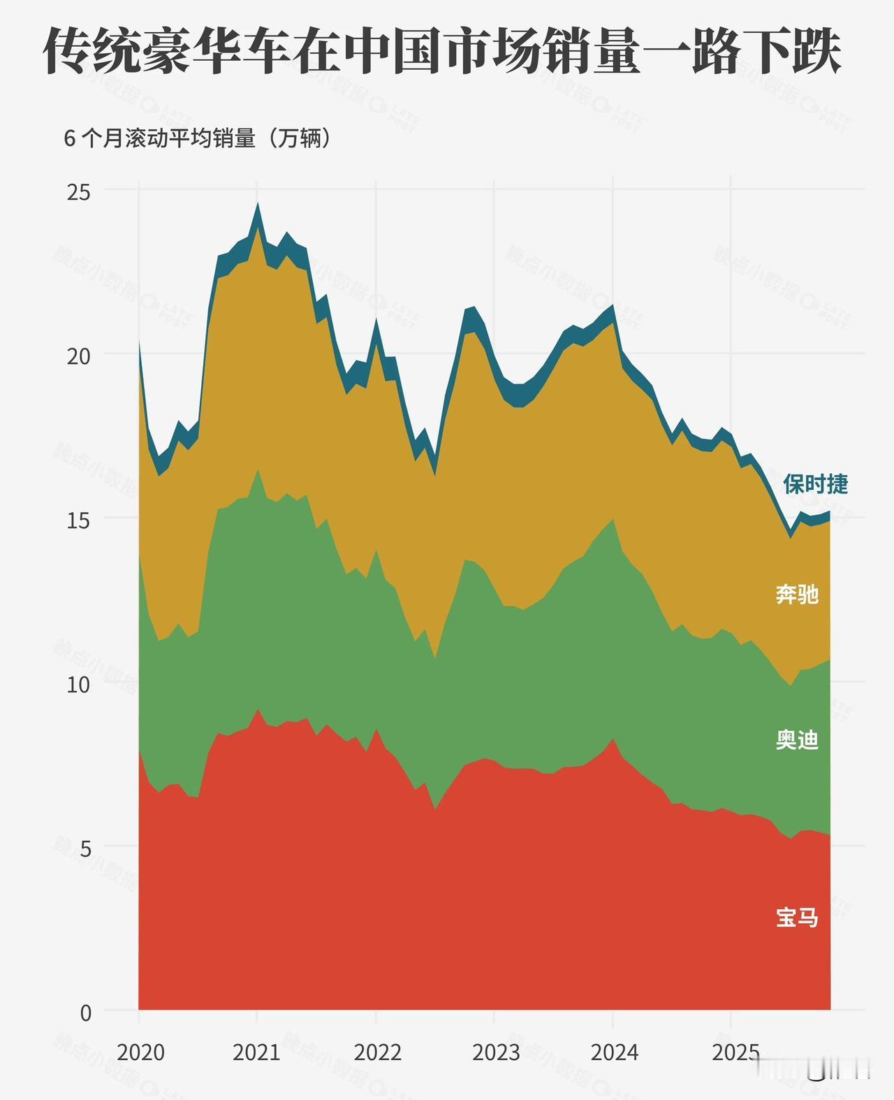 传统豪华车与新能源车中国市场销量趋势分析 一、传统豪华车市场销量持续下滑 2020-2025年传统豪华车(宝马、奥迪、奔驰、保时捷)6个月滚动平均销量呈现显著下降趋势。其中: 1、销量峰值:2021年左右,四品牌合计销量接近25万辆(滚动平均); 2、2025年低谷:截至2025年11月,合计销量已降至约15万辆,较峰值下降超40%; 3、品牌分化:宝马销量始终领先,但2025年降幅最陡;奥迪、奔驰销量相近,保时捷体量最小且下滑趋势最明显。 二、中高端车型销量排名:新势力崛起,传统品牌退坡 2020-2025年中高端车型(经销商报价超25万元)销量格局发生颠覆性变化: 1、2020-2021年:传统豪华车主导市场,奥迪A6L、宝马5系、奔驰GLC等稳居前三; 2、2022-2024年:特斯拉Model Y连续三年登顶,宝马5系、奥迪A6L退居二三位,新势力理想L7/L8、问界M9等开始进入前十; 3、2025年:新势力全面占据头部,小米YU7、问界M8/M9、理想L7等包揽前三,传统豪华车仅奥迪A6L(第4)、宝马3系(第5)勉强留守前五,宝马5系跌至第15位。 新势力品牌(特斯拉、理想、问界、小米)已取代传统豪华车,成为中高端市场的主导力量,消费者偏好向智能化、电动化车型转移。 三、新能源车销量与价格趋势:比亚迪持续领跑,价格战拉低均价 1. 品牌销量格局:比亚迪绝对领先,吉利、长安崛起 2021-2025年销量Top10品牌: ·比亚迪从2021年的58.4万辆增长至2024年的371.8万辆,2025年前三季度达254.2万辆,持续扩大优势; ·特斯拉2023年销量60.4万辆,2024年降至65.7万辆,2025年前三季度仅43.3万辆,增长乏力; ·吉利、长安、上汽通用五菱等国产传统品牌加速追赶,2025年吉利(109.2万辆)、长安(58万辆)销量超特斯拉。 2. 市场成交均价:持续下探,价格战白热化 ·2023-2025年新能源车月成交均价:从2023年初的22万元降至2025年的16万元左右,降幅达27%; ·价格驱动销量:低价策略(如比亚迪、吉利)推动销量爆发,高端车型(如特斯拉、蔚来)均价相对稳定但增长受限。 四、综合分析与趋势展望 1、市场替代效应显著:传统豪华车销量下滑与新能源车崛起形成鲜明对比,消费者对品牌溢价的敏感度降低,更关注智能化、性价比; 2、价格战重塑格局:新能源车均价持续下降,倒逼传统车企加速电动化转型,但短期内难以扭转销量颓势; 3、新势力主导未来:小米、理想、问界等新品牌通过精准定位(如家庭用车、智能座舱)快速抢占市场,2025年已全面主导中高端销量榜; 2025年中国车市已进入“新能源主导、传统品牌退坡”的新阶段,销量与价格的双重压力下,行业洗牌将进一步加剧,智能化与成本控制能力将成为核心竞争力。