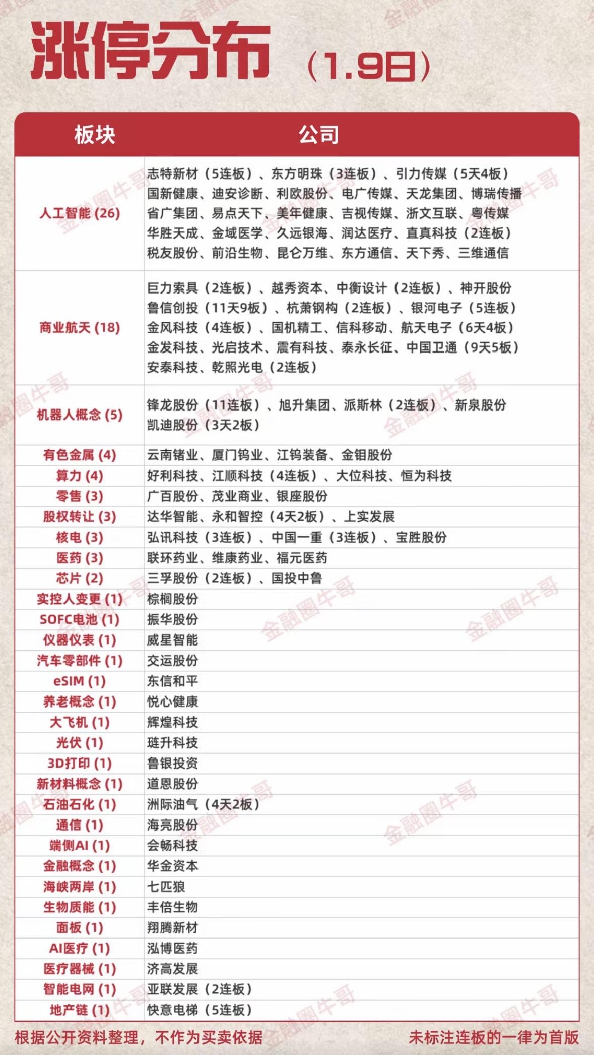 涨停分布揭秘 揭秘1.9日涨停板背后的秘密,带你领略市场风云! "涨停潮来袭!志特新材5连板领跑,东方明珠、引力传媒紧跟,人工智能、商业航天板块爆发,医药、芯片活跃,市场热点纷呈。"