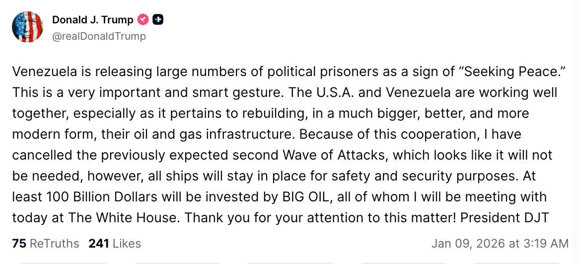 新闻快讯——特朗普称委释放政治犯,美委油气合作取消袭击,油企将投千亿!