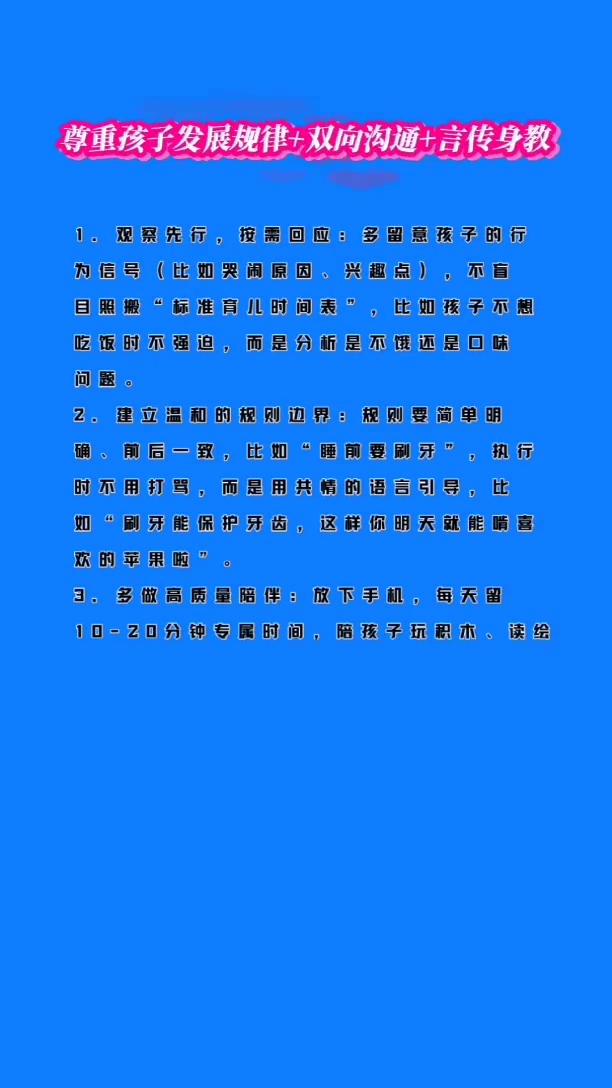 尊重孩子发展规律+双向沟通+言传身教。 ·1.观察先行,按需回应:多留孩子的行为信号(比如哭闹原因、兴趣点),不盲目照搬"标准育儿时间表",比如孩子不想学习,而是分析是不饿还是口味问题。 ·2.建立温和的规则边界:规则要简单明了,不用打骂,而是用共精的语言引导,比如"刷牙能保护牙齿,这样你明天就能听喜欢的苹果啦"。 ·3.多做高质量陪伴:放下手机,每天留10-20分钟专属时间,陪孩子玩积木。读绘本或户外宾跑,互动中多听孩子表达,少用"你应该"-不许"这类指令。 ·4.允许孩子试错成长:孩子自己穿衣服,收拾玩具时,腰怕做得慢或出错,也别急,看代势,试错的过程能帮他建立独立能力和抗挫折力。 ·5.家长做好精绪管理:面对孩子的调皮或哭闹,先稳住自己的精绪,再处理问题,避免情绪化说教,你的情绪稳定,是孩子安全感的重要来源。