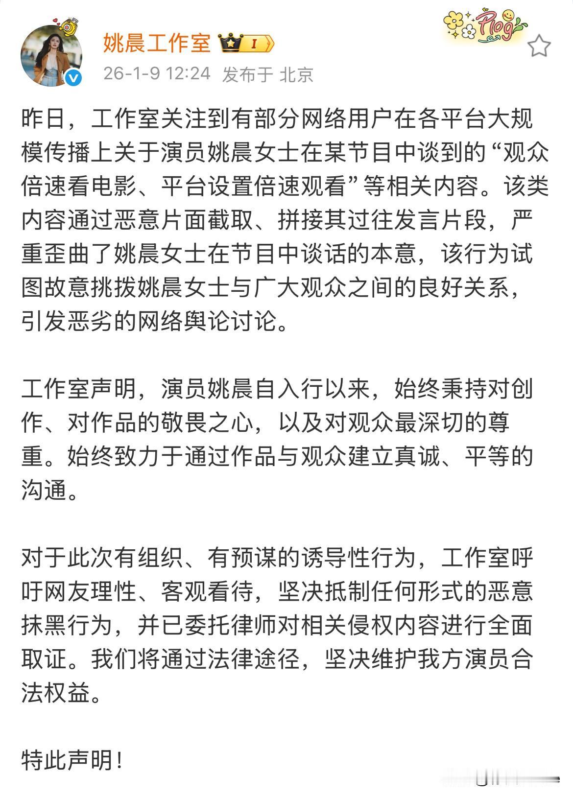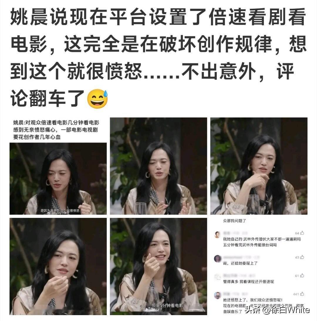 1月9日,姚晨工作室回应倍速观影争议 称有人故意带节奏曲解姚晨本意!在我看来,大部分网友说的都是实话,姚晨应该做的不是指责倍速观影这个行为,而是应该呼吁行业把作品做的更好,如果剧好看谁会快进,就比如《甄嬛传》《家有儿女》这些,大家反反复复看的老剧,没几个人会倍速看,因为每次看都有不同感受,而现在很多剧注入了太多水镜头,所以观众才会开倍速 有句话叫存在即合理,存在就是有需求,理解姚晨,但她应该关注的重点不应该是观众,而应该是作品本身,好作品没有观众会开倍速……开倍速其实就是在差评