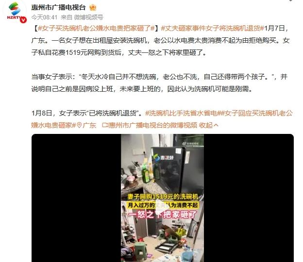 女子觉得冬天水太冷了,洗碗太冰手了,然后自己在网上买了台洗碗机,结果老公气的直接把家砸了,就为这1519块,家里一片狼藉。 广东的这位女子,是两个孩子的妈妈。 天冷了,水冰手,洗碗成了大难题。她说老公也不洗,自己又带着俩娃,之前因为生病没上班,之后打算出去工作。 想想以后更没时间洗碗,她觉着洗碗机是个“必需品”。 可老公一听就反对,说水电费太贵,消费不起。 两人没谈拢,女子就自己上网下单了。 但是没想到洗碗机送到家后,丈夫彻底火了。 争执之中,男子动手把家里东西砸了一通。 女子看着满地狼藉,心凉了。第二天,她默默把洗碗机退了货。 其实吧,一千多块的洗碗机,说贵不算天价,说不贵也不算少。 女子花钱买,也许是她衡量了很久的“对自己好一点”的方式。带两个孩子、做家务,手泡冷水,长期下来其实也是很辛苦的。 但男的愤怒也能想到一点,可能他脑子里绷着一根弦,房租、水电、孩子开销,每个月数着钱过,突然多出一个“非必需”的电器,他感觉压力一下子上来了。 问题可能根本不是洗碗机,而是这个家里,两个人都在透支,却看不到对方的累。 她可能觉得“你不洗还不让我用机器”,他可能觉得“你不挣钱还乱花钱”。话堵在心里,砸东西成了最糟的表达。 然而,对于这件事情有不少网友表示:“摔东西算什么本事?有本事去多赚点钱啊!” 也有表示理解男的,压力大时看到计划外支出真的上火。 也有表示同情这位妈妈:她连一千多块的自主权都没有吗?心疼这位妈妈。 我觉得两人都没错,也都有错,缺的是坐下来算账+交心。你们认为呢?