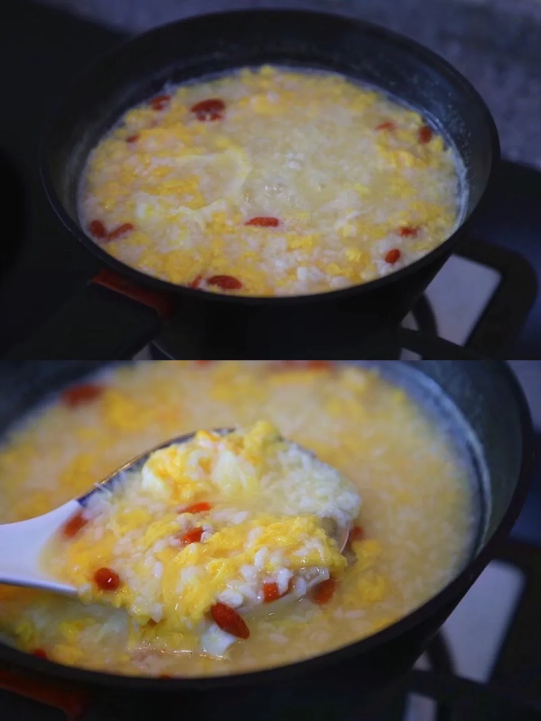 19.我还打了两个鸡蛋液进去,不用马上搅拌 鸡蛋成型之后再动它 还放了一些泡过的枸杞,这样不仅颜色好看 也更营养