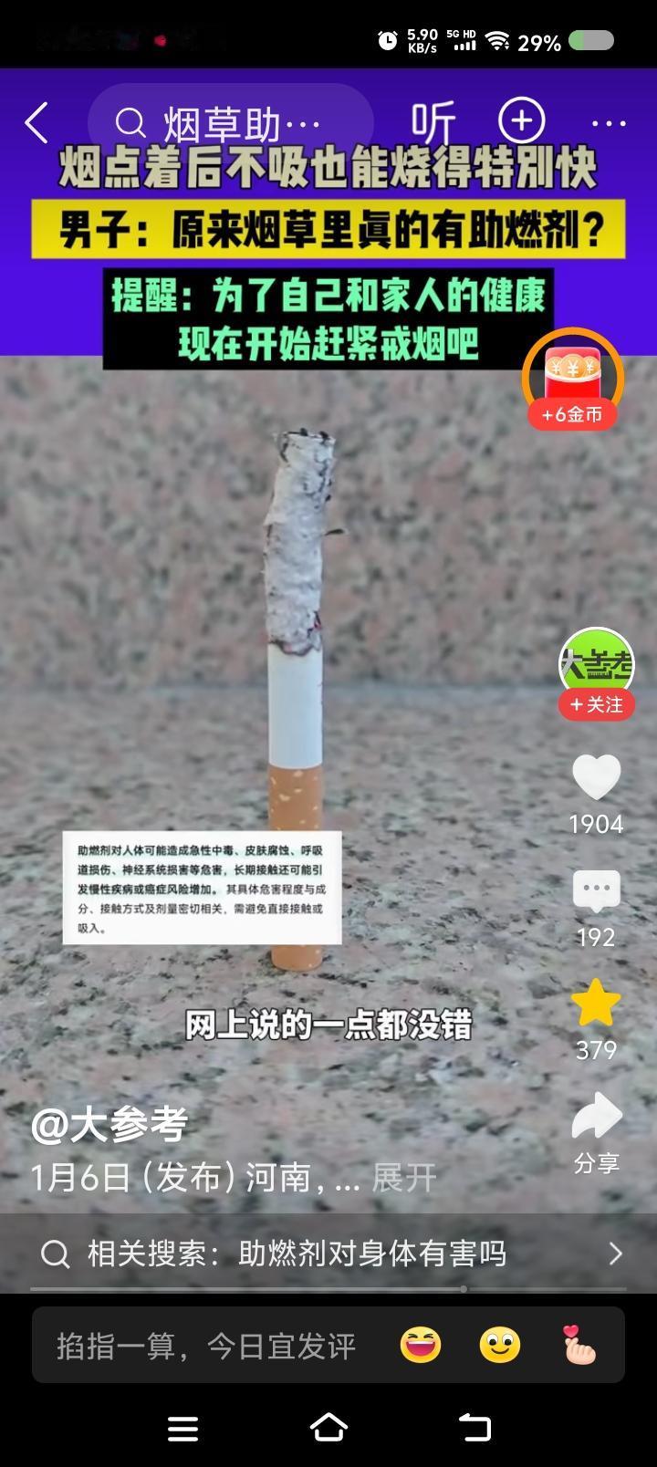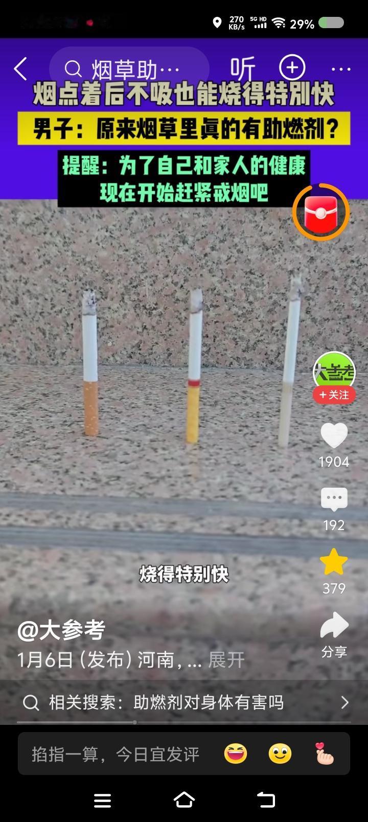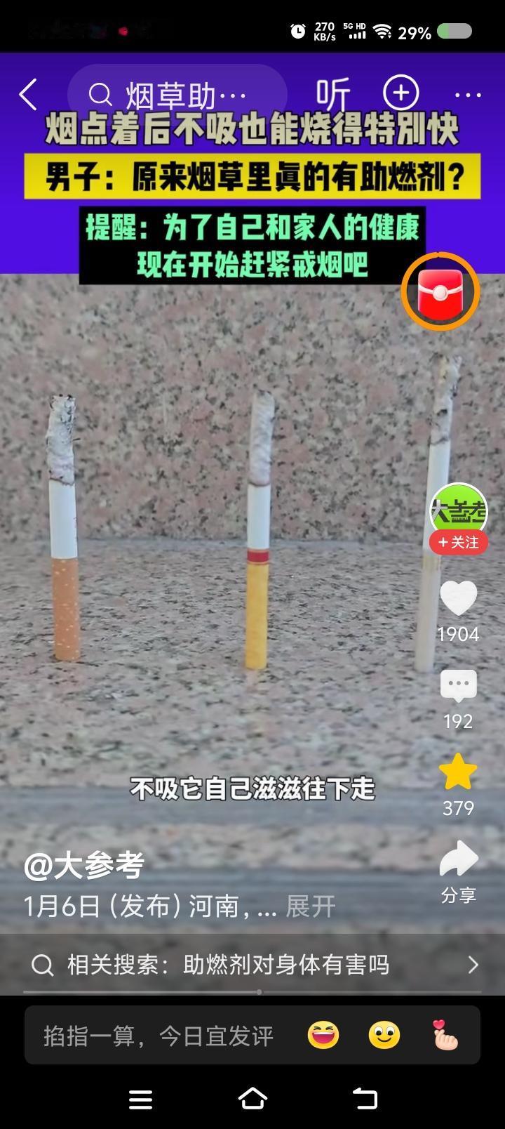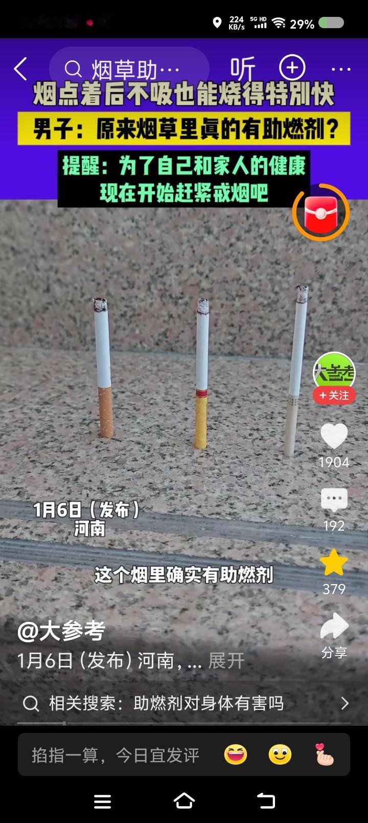 香烟里有助燃剂?—— 据报道,有人点燃一支烟,不吸它也烧得特别快。此人认为网友说的没错,烟草里放了助燃剂。 点评: 如果属实,为什么要放?它肯定有危害。 那茶里呢?会不会也放点增添香味的什么物质? 建议有关部门调查!