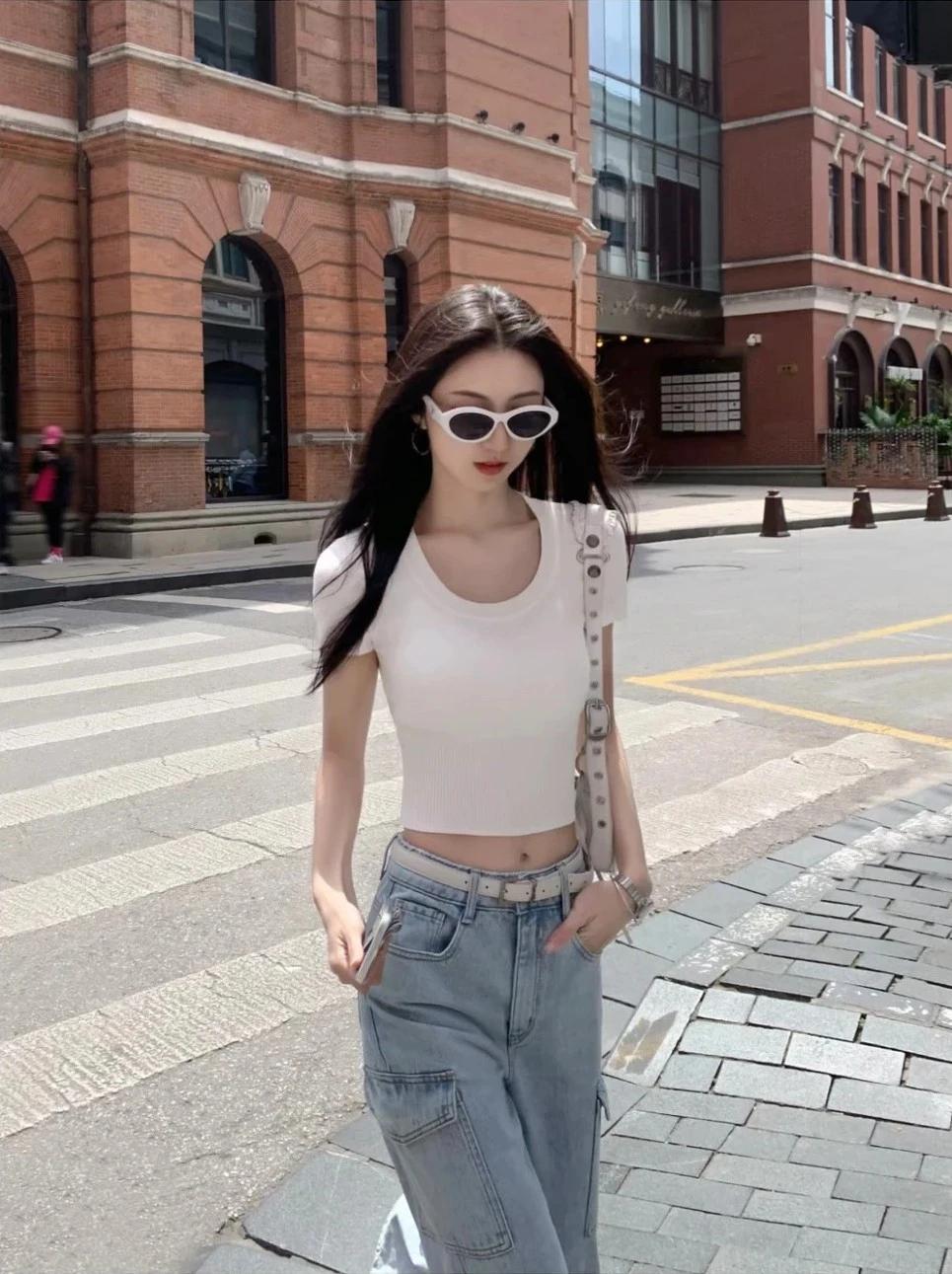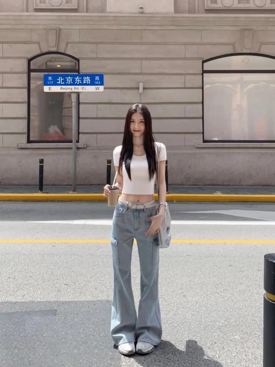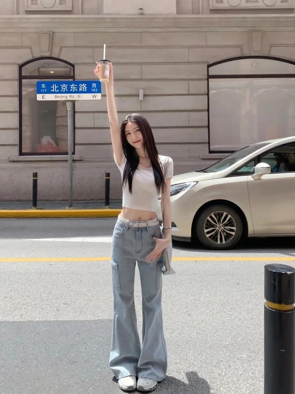 元气少女在街头,白T恤+牛仔裤,轻松自在!🌞👗👖