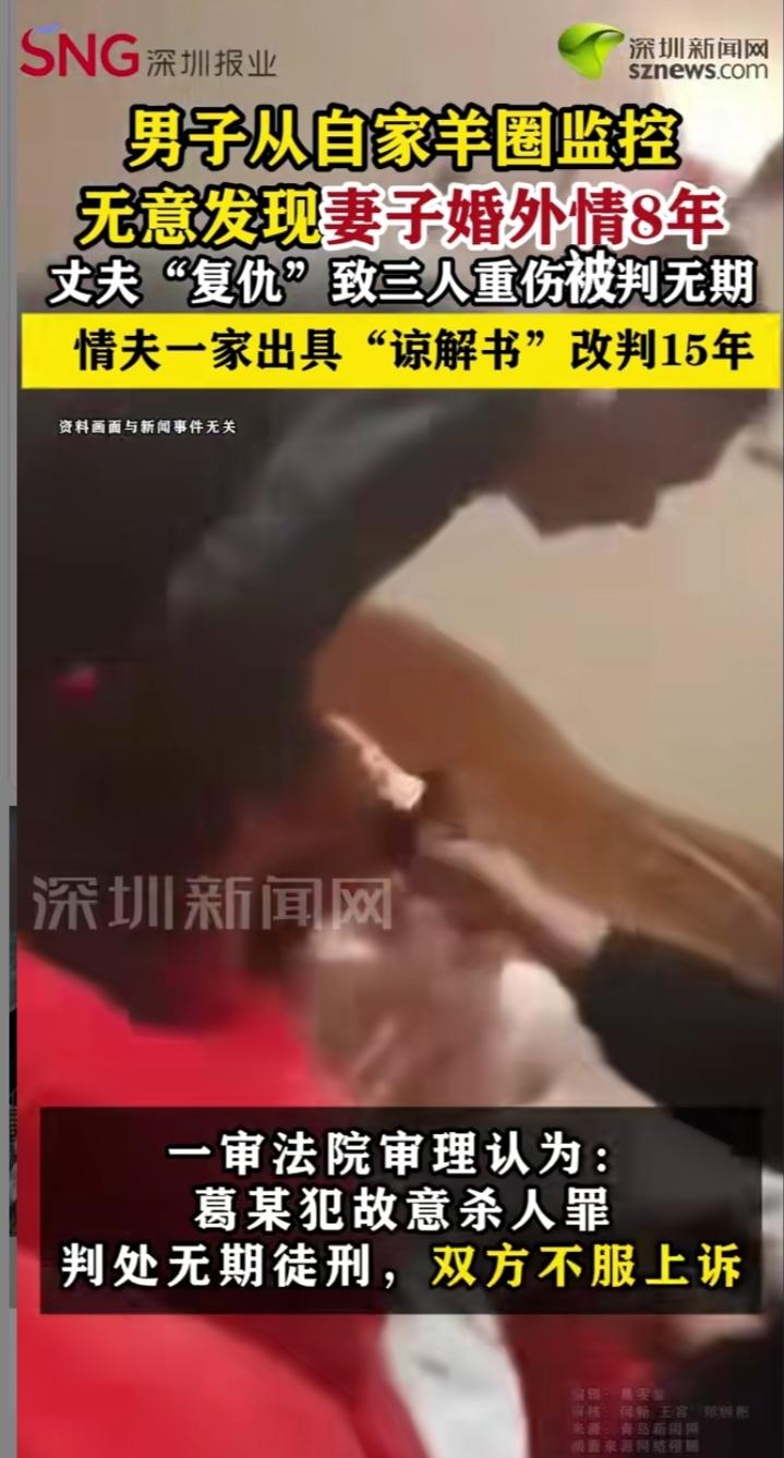 羊圈监控揭露8年婚外情,男子报复获刑15年 近日,河南原阳男子葛某通过自家羊圈监控,意外发现妻子田某某与同村许某甲存在长达8年的不正当关系。此前葛某外出打工维持家用,曾发现二人联系痕迹,经对峙后对方承诺断绝往来,却仍暗中持续联系。 2024年6月,葛某回家后再次在妻子手机中找到出轨证据,愤怒之下持剔骨尖刀前往许某甲家报复,造成许某甲及其妻儿三人重伤二级、一人轻微伤。一审法院以故意杀人罪判处葛某无期徒刑,二审期间,葛某亲属与被害方达成赔偿协议并获谅解,法院综合婚姻家庭矛盾起因、被害人过错及认罪悔罪情节,改判其有期徒刑15年。 法律明确,故意伤害致人重伤可处3年以上10年以上有期徒刑,本案因特殊情节从轻处罚,但以暴制暴终需承担法律责任。婚内婚外情 婚外情