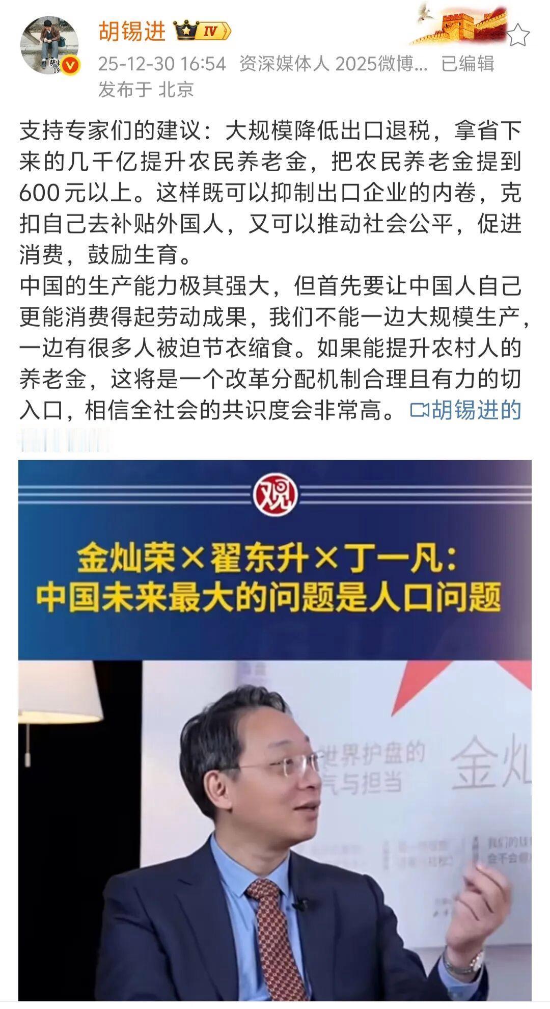 我支持胡锡进支持专家的建议,老胡经常被别人说是墙头草,但这一次他的观点鲜明,支持他的理由是: 1:大规模降低出口退税 出口退税是为了鼓励企业出口,增加出口企业产品在海外的竞争力,说到底是通过补贴让他们降低价格销售到国外,也就是把老百姓的血汗钱补贴给了外国人,而大部分的老百姓是在节衣缩食,我都吃舍不得用,从来舍不得乱花1分钱。 为什么不能把低价的产品销售给我们自己的老百姓,为什么不能把这个补贴的钱让我们自己的老百姓来享受,鼓励出口那是几十年之前的事情,现阶段应该到了让我们自己老百姓提高生活质量的时候了,让我们自己的老百姓消费的产品价格更低更实惠,让我们自己的老百姓舍得花钱敢于花钱,这样也就拉动了内需, 内需拉动起来以后,就会形成良性循环,促进经济的进一步发展。 2:把农民养老金提高到600元以上 老百姓中最辛苦的就是农民,他们没有稳定的收入,他们的养老是最大的问题,建国初期,我们以农业养工业,我们以农业来哺育工业,现在我们的工业发展起来了以后,工业应该是反哺农业,让我们的农村留得住人,让我们的农村留得住年轻人。 我们的农村人口占比很高,农村人口是生孩子的主力军,如果能够把农民的养老金提高到600块钱以上,会大幅度提高全国的平均生育率,如果能够把农民的养老金提高到600块钱以上,会让农民想生孩子,敢生孩子,积极的生孩子,人口问题的困扰会自然而然的解决。 祝愿我们伟大的祖国繁荣富强,祝福中华民族早日实现伟大复兴!