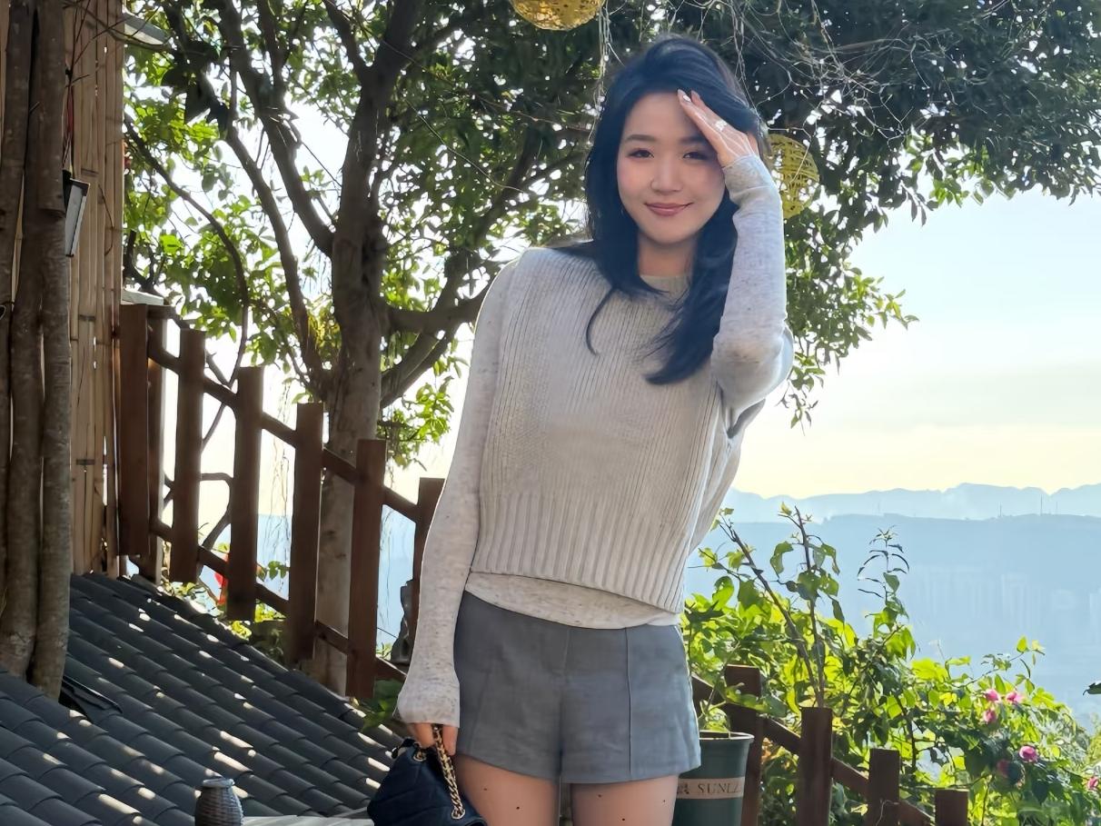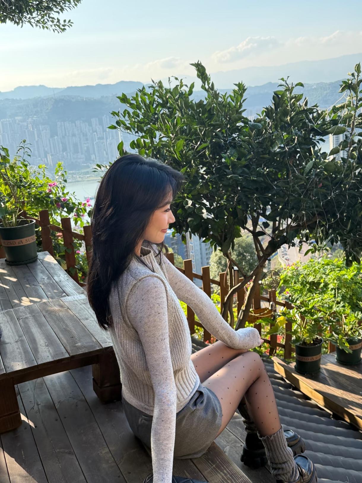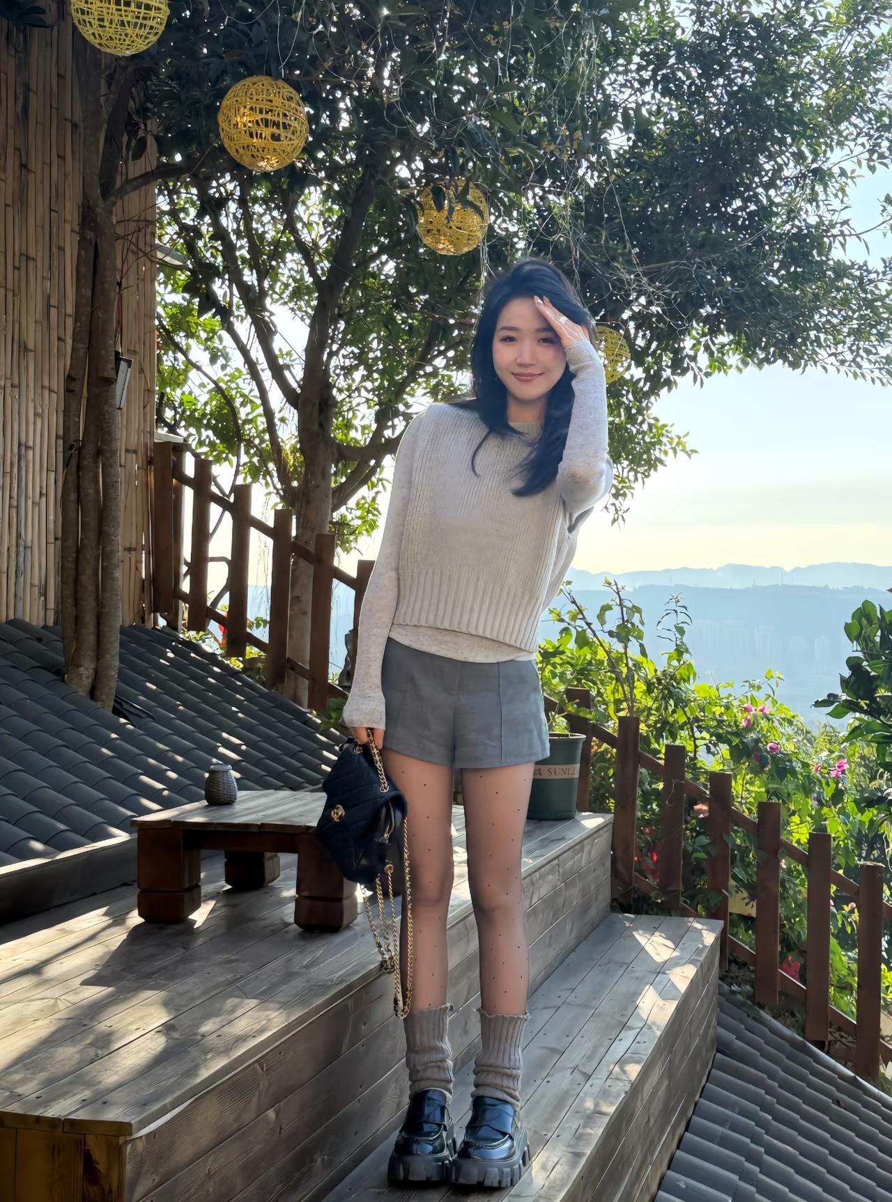 露台暖阳里的休闲系穿搭,慵懒又显格调 在山城的露台木阶上,她的穿搭把秋日的松弛感拿捏得恰到好处。浅米色针织毛衣是视觉核心,软糯的坑条纹理带着温柔的肌理感,宽松的版型弱化了身形线条,随性地搭在身上,既藏住了秋日的微凉,又透着不刻意的慵懒。 下装选了灰色高腰短裤,利落的剪裁刚好中和了毛衣的蓬松感,露出的腿部线条在堆堆袜的修饰下更显纤细。 浅灰色的堆堆袜松松垮垮地落在脚踝,和毛衣的浅调形成呼应,再踩上一双黑色厚底鞋,酷感的鞋型瞬间拉高了整体的时尚度,也让休闲的搭配多了几分街头感。 肩头斜挎的黑色链条包是点睛之笔,金属链条的亮泽和包身的哑光质感碰撞,为浅色系的穿搭添了一抹精致的暗调。 整体搭配以浅米、灰色为主调,黑鞋黑包做点缀,在露台的暖阳和远山绿意的映衬下,既保留了日常穿搭的舒适感,又靠细节的呼应让造型显得层次分明,随性又不失格调。