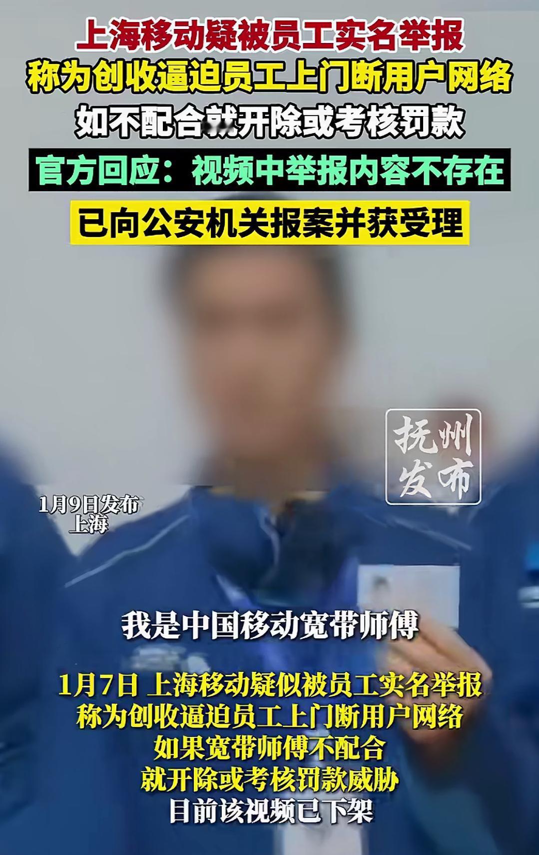 但凡敢拿着自己身份证实名举报的 那这事指定是板上钉钉的真!没一个人会拿自己的身份和前程开玩笑,尤其这次硬刚的还是中国移动这种央企巨无霸,这可不是跟小公司扯皮赌气,没实打实的证据、没被逼到走投无路的绝路,谁敢这么豁出去?纯属嫌自己日子太安稳,想进去踩缝纫机蹲号子才会这么干吧! 更别说还是三名员工一起实名举报,这就更说明问题了,绝对不是单一个人的私人恩怨,肯定是上海移动内部的那些操作早就突破底线、没了分寸,把底下干活的员工恶心得浑身难受,实在忍无可忍才咬牙站出来的。这些员工心里还有良知和底线,不愿意跟着公司同流合污,更不想昧着良心去坑害咱们普通用户的切身利益,说白了就是宁肯跟公司鱼死网破丢了工作,也绝不丢了自己的良心,这份勇气真的太难得,换一般人早就被考核罚款、开除威胁给拿捏住了。 结果现在官方跳出来说内容不真实,举报视频还直接下架了,这不是明摆着的疑点吗?这到底是不是在逃避责任?明眼人都看得清清楚楚!这节骨眼上上海移动忙着辟谣,纯属此地无银三百两,越解释越黑,越狡辩越让人觉得心里有鬼,只会更招人反感。你说内容不真实,倒是拿出实打实的调查证据啊?连举报人身份都没核实清楚,就一口咬定是假的,这说服力在哪? 真要是行得正坐得端,何必着急下架视频?现在大家要的不是一句轻飘飘的“不属实”,而是透明的调查过程和明确的说法!明眼人都懂,这时候最该做的不是嘴硬狡辩、捂盖子,而是赶紧放下央企的架子,痛痛快快承认可能存在的问题,老老实实给社会大众、给那些可能被坑的用户们道个歉,该整改的整改,该追责的追责,这才是央企该有的担当和气度。不然只会越抹越黑,把这么多年攒下的口碑彻底砸烂,到时候再挽回可就难了!