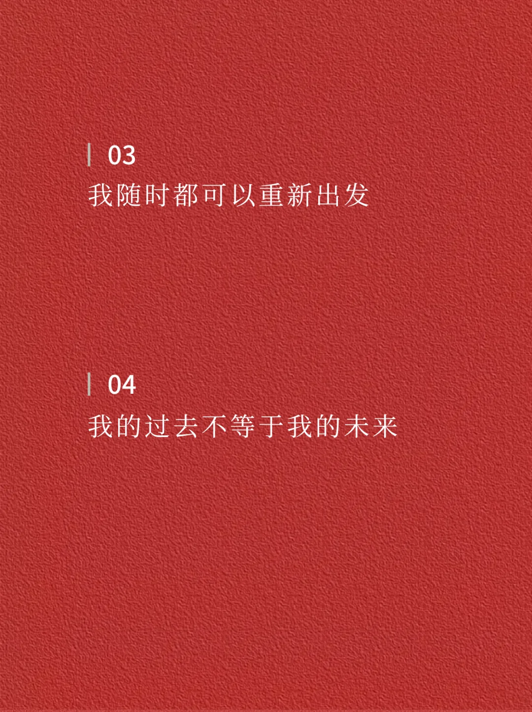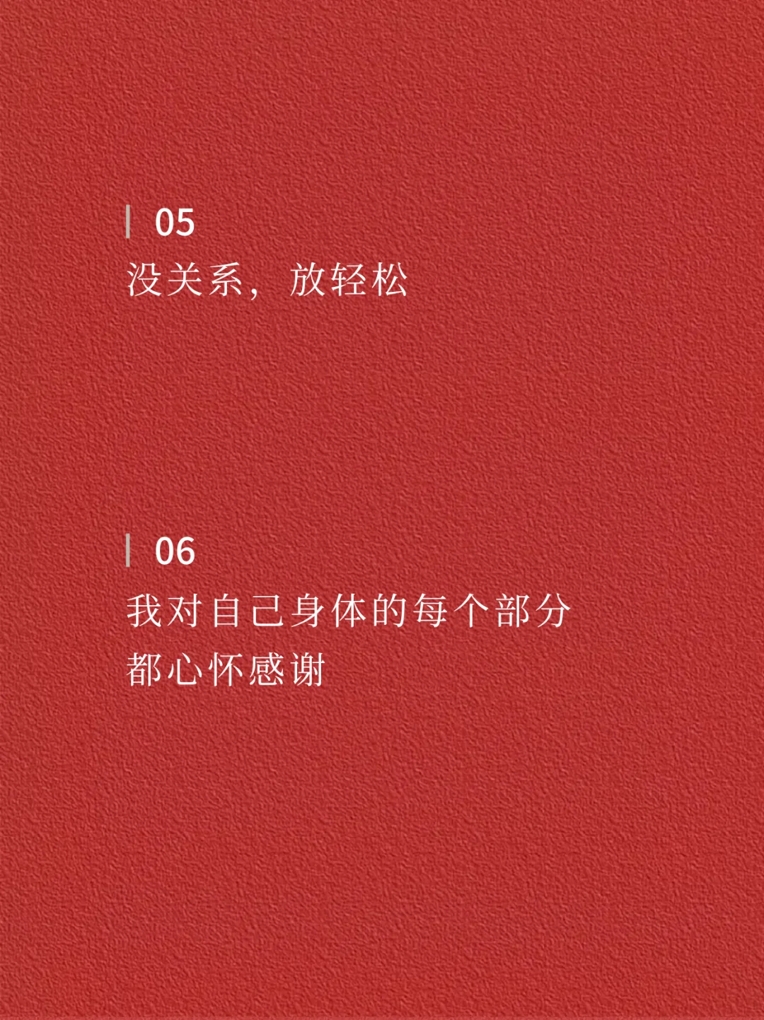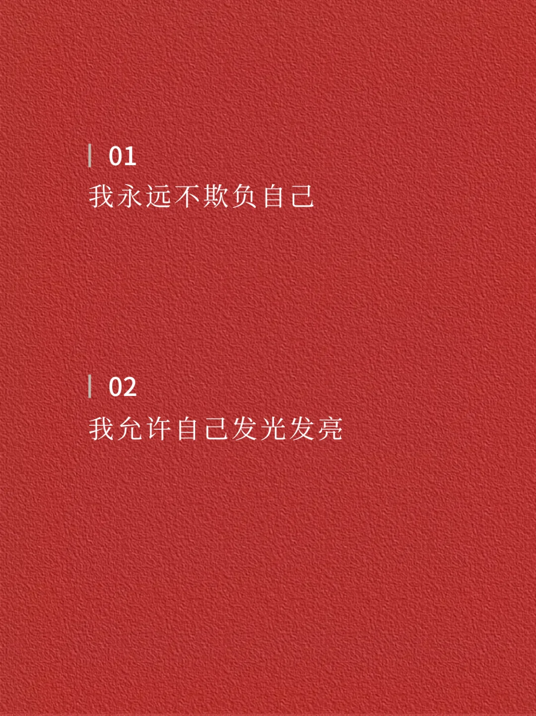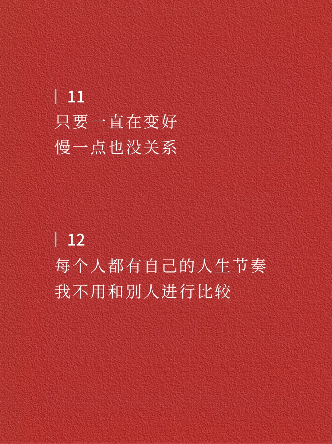 🌿🌿 01 我永远不欺负自己 · 02 我允许自己发光发亮 · 03 我随时都可以重新出发 · 04 我的过去不等于我的未来 · 05 没关系,放轻松 · 06 我对自己身体的每个部分都心怀感谢 · 07 今天又是美好的一天 · 08 我放下对未来过多的思虑 · 09 我比自己以为的要强大和幸运 · 10 我值得被爱 也值得拥有幸福 · 11 只要一直在变好 慢一点也没关系 · 12 每个人都有自己的人生节奏 我不用和别人进行比较 · ✨✨ —The end— 🌈感谢阅读