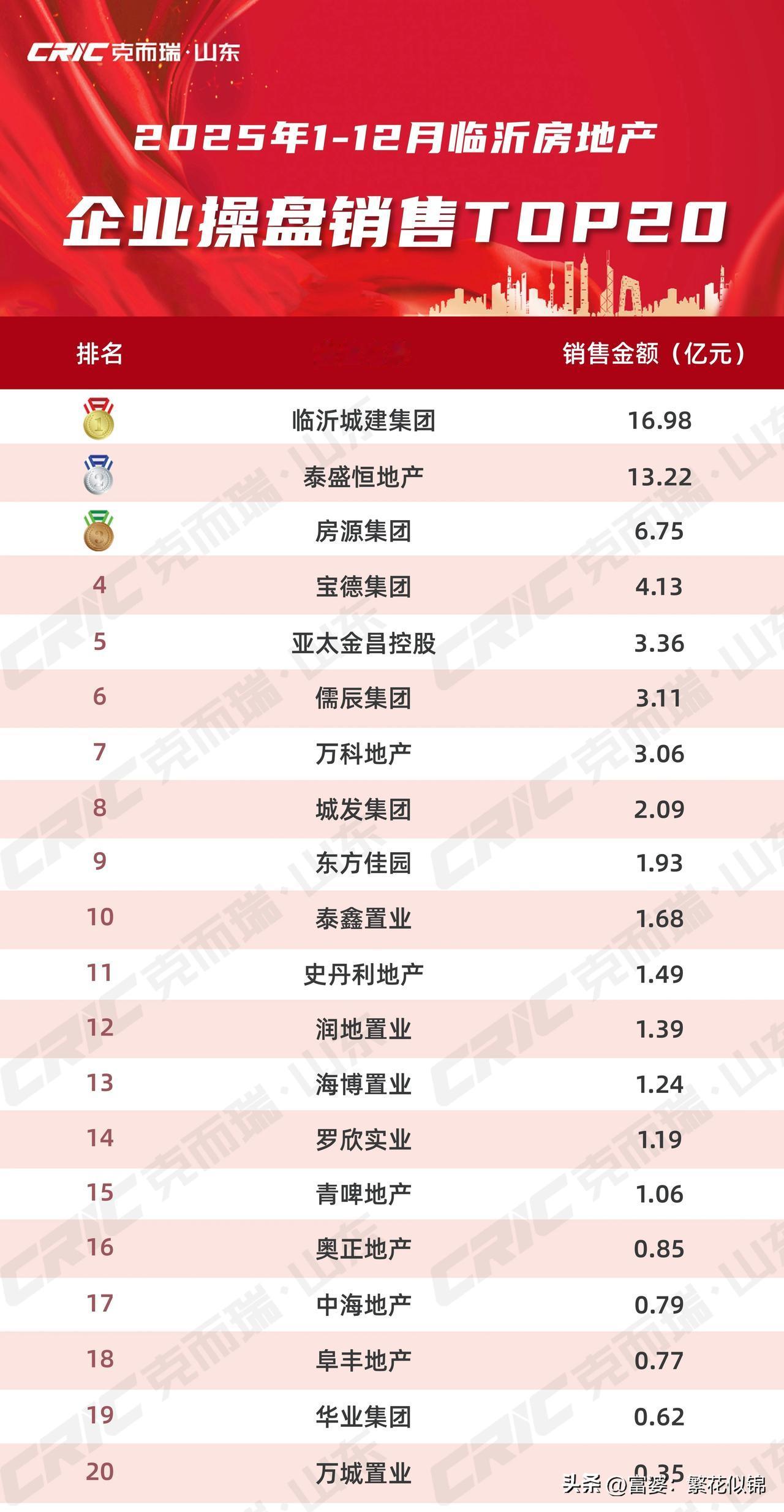 厉害了,临沂这一国企25年楼盘销售金额16亿多 刚刚刷到在临沂城建集团上班的同学转发的一篇文章,是来自某机构统计整理发布的。 临沂国企临沂城建集团在25年的房地产企业销售金额排名第一,销售金额16.98亿,作为临沂国企,确实是实至名归,开发的楼盘都是品质比较高的,周边配套也是非常齐全,还有一个就是价格也非常高,一般人还得考虑考虑。 第二名是泰盛恒地产,这两年非常有名的房产企业,开发的楼盘也非常多,临沂首个第四代住宅项目金泰华章就是这个公司开发的,不知道和临沂最火的泰盛广场有啥关系?当前环境下,能够开发房地产的民营企业也没有几家了。