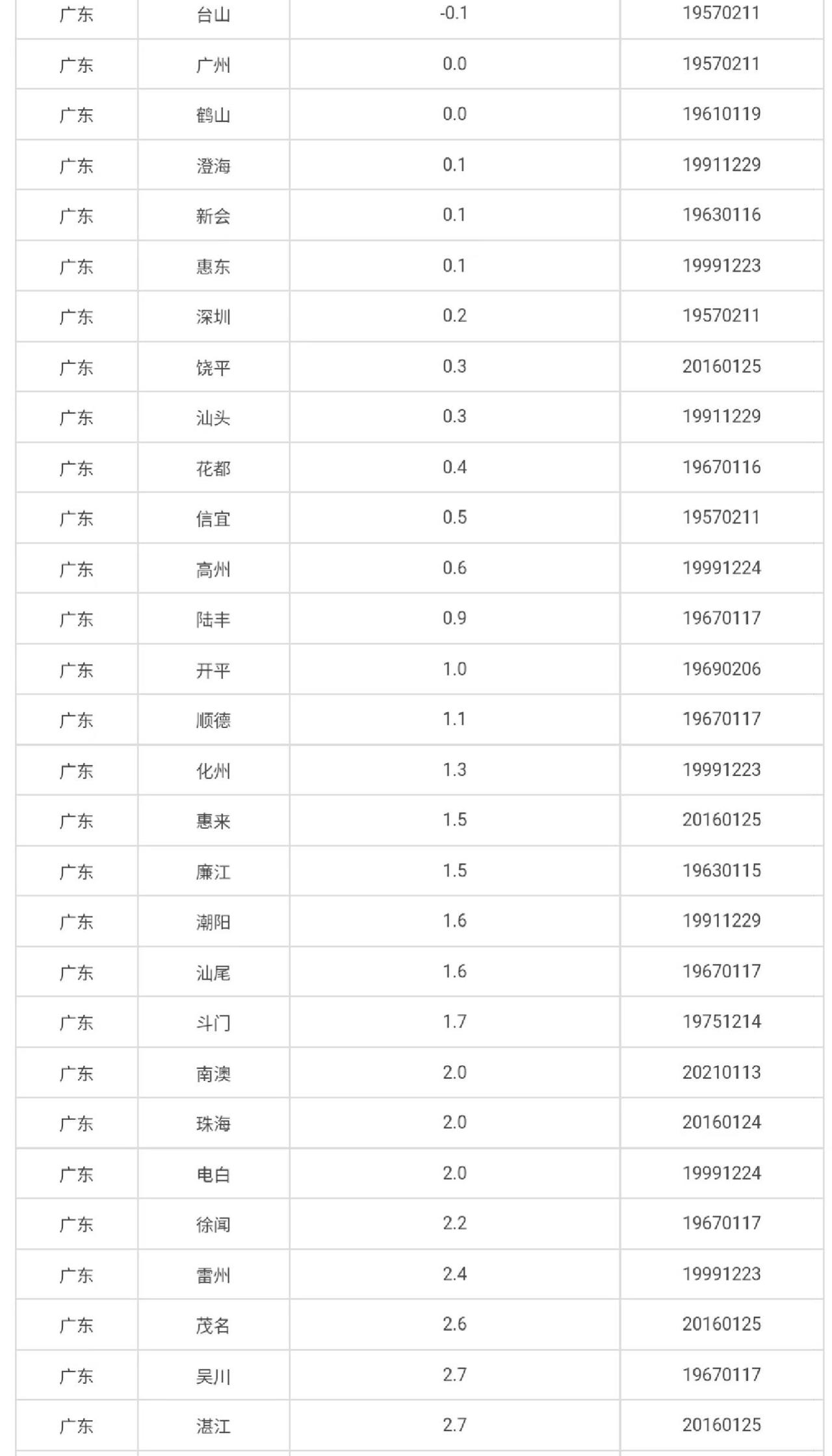 广东各地历史极端最低气温列表 值得注意的是,图中广东冷极点——梅县国家气象台站海拔只有116米,在1955年的毁灭级寒潮中,遭遇极端的辐射降温,气温降至-7.3摄氏度,该纪录作为正式的全省纪录至今未被打破。 地理 南北方温差 温带海洋性气候 南方气温将再下一个台阶 气候类型分布 南方的湿度 南北方气候差异 温度 广东