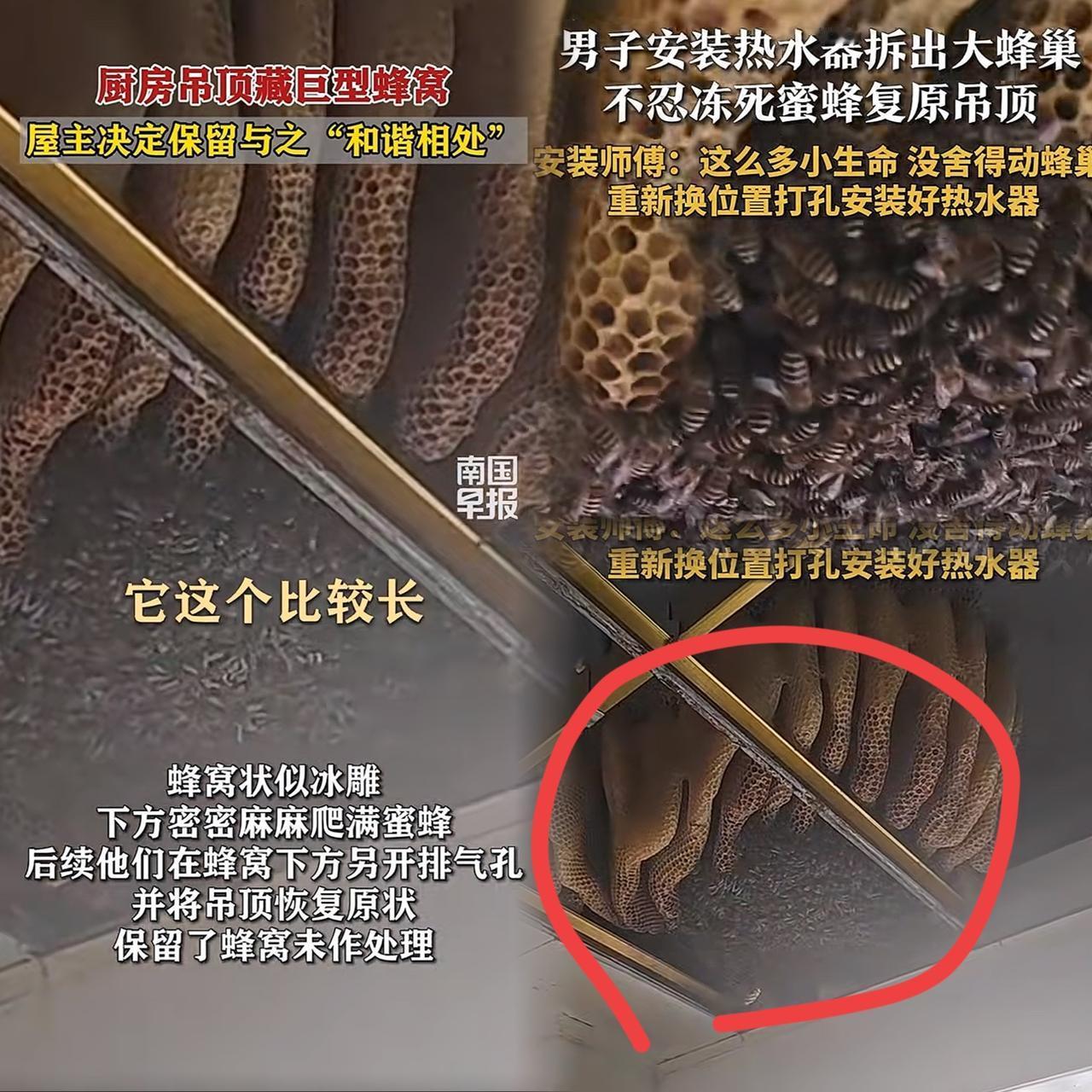 细思极妙!江苏一男子家装热水器,师傅拆吊顶竟发现大型蜂窝,密密麻麻的蜜蜂让人直起鸡皮疙瘩。本以为会是一场“人蜂大战”,没想到结局超暖心! 原来,蜜蜂是顺着未封的旧排气孔钻进来的,吊顶里暖和干燥,成了它们的“安乐窝”。 正值寒冬,若将蜜蜂赶出,无疑让它们冻饿而死。 男子和师傅一合计,决定不破坏蜂巢,给蜜蜂留条活路,还特意重新选了安装位置,干活时轻拿轻放,生怕惊扰了这些小生命。 这波操作,真是让人感叹人与自然的和谐共处。 有时候,我们不必对小生命赶尽杀绝,换个思路,给它们留点空间,也是给我们自己留份温柔。 你觉得呢?要是你遇到这种情况,会怎么做?快来评论区聊聊吧!