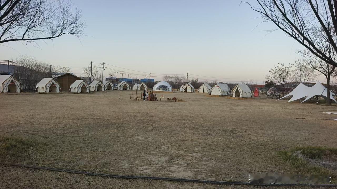 当我站在这片露营地的开阔草地上,晚风轻拂过光秃秃的枝桠,远处的帐篷错落排开,像撒在大地上的白色星星。没有城市的喧嚣,只有风穿过帐篷的轻响和天边慢慢褪去的霞光。心里的烦躁好像被这片温柔的暮色揉碎了,脚下的黄草地、远处的圆顶帐篷,连光秃秃的树都成了治愈的风景,原来安静的自然,才是心灵最好的解药。治愈系露营地