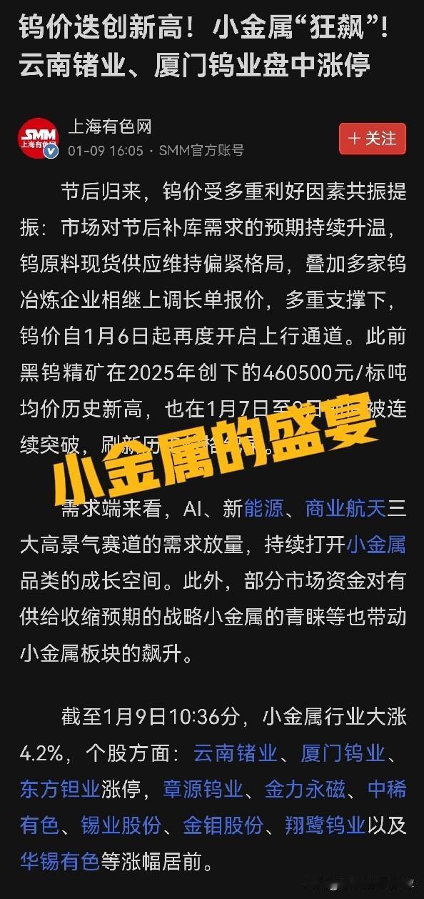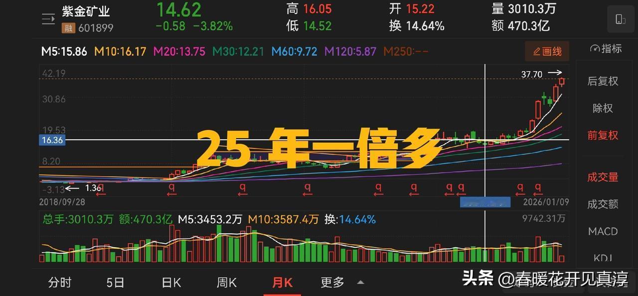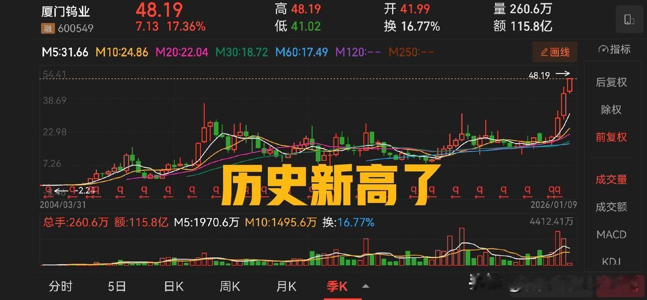 有朋友留言说坚定的选择厦门钨业和紫金矿业,紫金矿业作为有色长牛白马股,没有问题,厦门钨业作为小金属钨的龙头企业,也是老朋友了。 紫金矿业去年翻了一倍多,万亿市值指日可待,厦门钨业去年到现在翻了两倍,一个非常陡峭的斜率走上来,这是牛股的典型特征。 两个品种都在不断的新高中,是牛市途中。 有兴趣的朋友可以仔细研究一下,是否还可以买。我已经死猪不怕开水烫了,也就在云南铜业里面度过有色的这一波了。 遗憾当然有,重在参与吧。