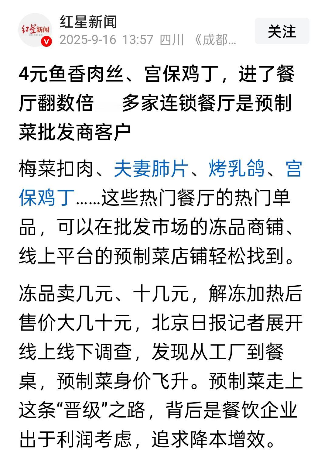 老百姓之所以抵制预制菜,不是没有道理的。 4元一份的宫保鸡丁、鱼香肉丝,加热以后饭店就卖几十元,还有天理吗? 先不说这价格是否合理,也不说这印在包装上的这几十种添加剂是否对人体有害。 单单是想一想这4元钱的超低价格 ,就让人不寒而栗。 4元钱不说在大城市,就是在乡镇,恐怕也只能买几个馒头吧。 可现倒好,饭店却可以用4元钱从供应商那里买到宫保鸡丁或鱼香肉丝。 这样的预制菜能吃吗?我相信,任何人用脚后跟都可以想出答案。 发展预制菜产业已经成为国家战略,老百姓不反对,但是预制菜的乱象不应该无人过问,预制菜的国家标准应该尽快制定。