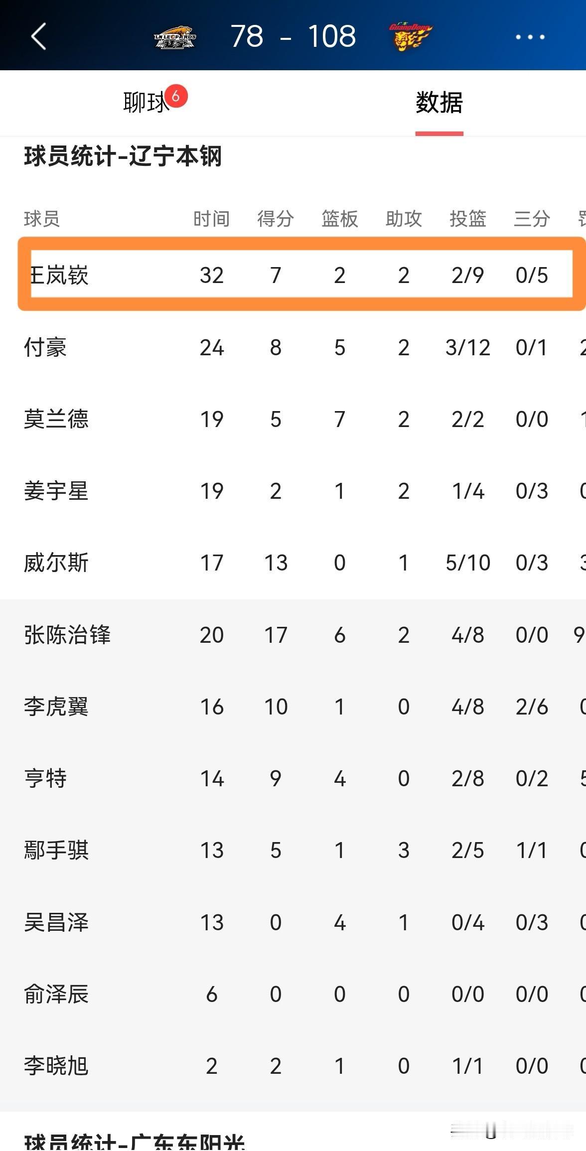 辽宁本钢大将王岚嵚真是手感冰凉!在今天辽宁本钢主场以78:108惨败于广东东阳光的比赛中,王岚嵚的投篮手感非常的糟糕,他在首发出战的32分钟里,投篮9中2,其中三分球5中0、罚球3中3非常低效的得到7分,还有4次失误,他的场上正负值为-26。 希望王岚嵚能够在接下来的比赛中调整好自己的状态,在赵继伟因伤无法出战的情况下,王岚嵚对于辽宁本钢实在是太重要了。