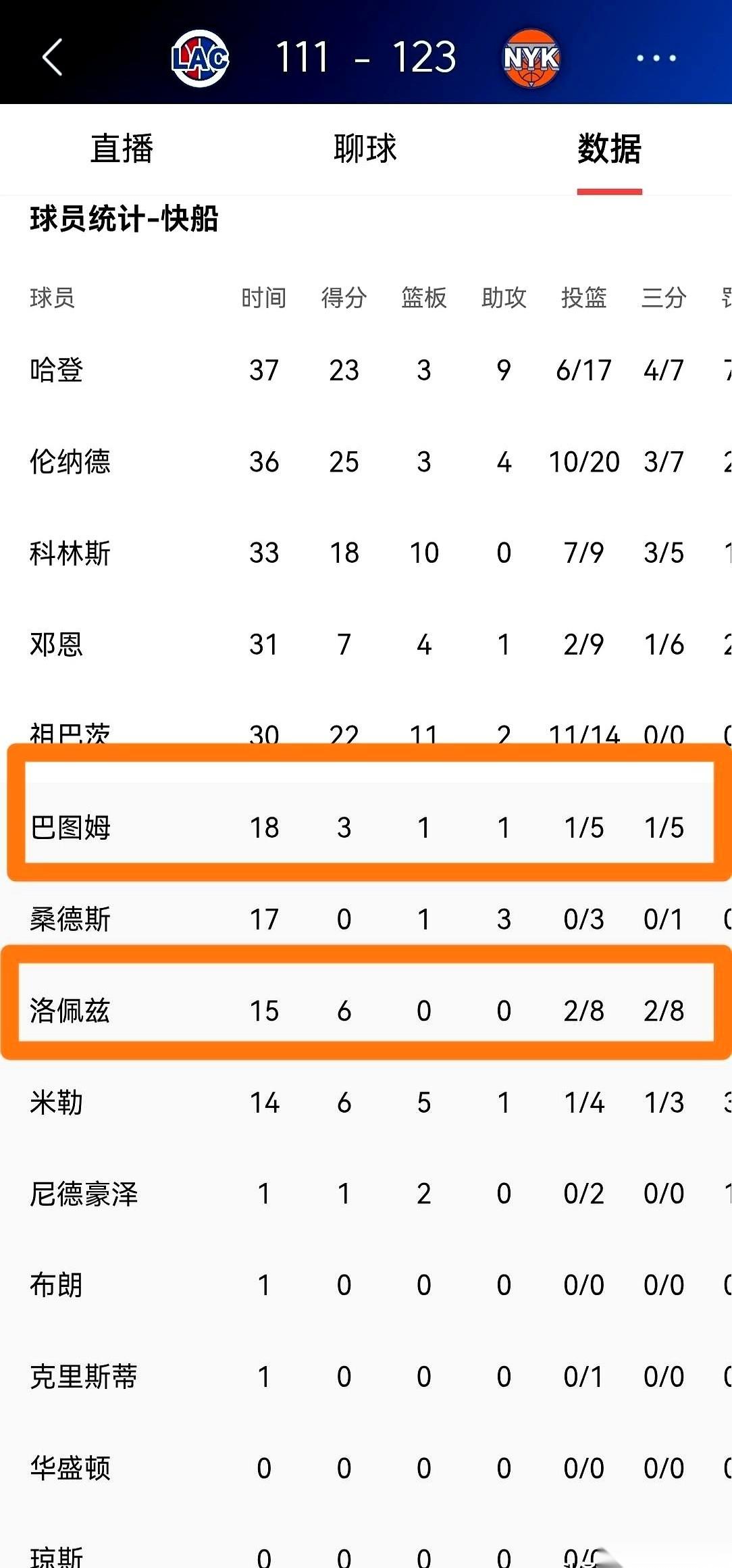 三分线外,俩人咣咣打了10个铁。 13次出手,就进了3个。 我有时候真觉得,巴图姆和洛佩兹现在上场,就像俩个幽灵,飘在底角,飘在弧顶,你甚至感觉不到他们的存在。直到球传到他们手上,然后“哐”的一声,你才猛地惊醒:哦,原来场上是5打5。 一个打了18分钟,拿3分。 另一个打了15分钟,拿6分。 讲道理,你俩是来干嘛的?热身吗?感受客场气氛吗? 这不是随便一场常规赛啊兄弟。这支球队的目标是什么,大家都门儿清。每一个回合,每一次出手,都应该是冲着那个最终目标去的。你指望这俩老将上来,是希望他们用经验稳住军心,用那该死的投篮惩罚对手。 结果呢? 他们现在惩罚的是自己人。是小卡和乔治累死累活突进去,吸引了包夹,然后分出来的大空位。 这种球,说白了就是给你嘴里喂饭,你都能吐出来。 真的,看到这种表现,心里不是生气,是那种深深的无力感。就像你憋着一股劲儿,结果一拳打在了棉花上。 这哪是争冠球队的拼图啊,这简直就是对手安插进来的卧龙凤雏。