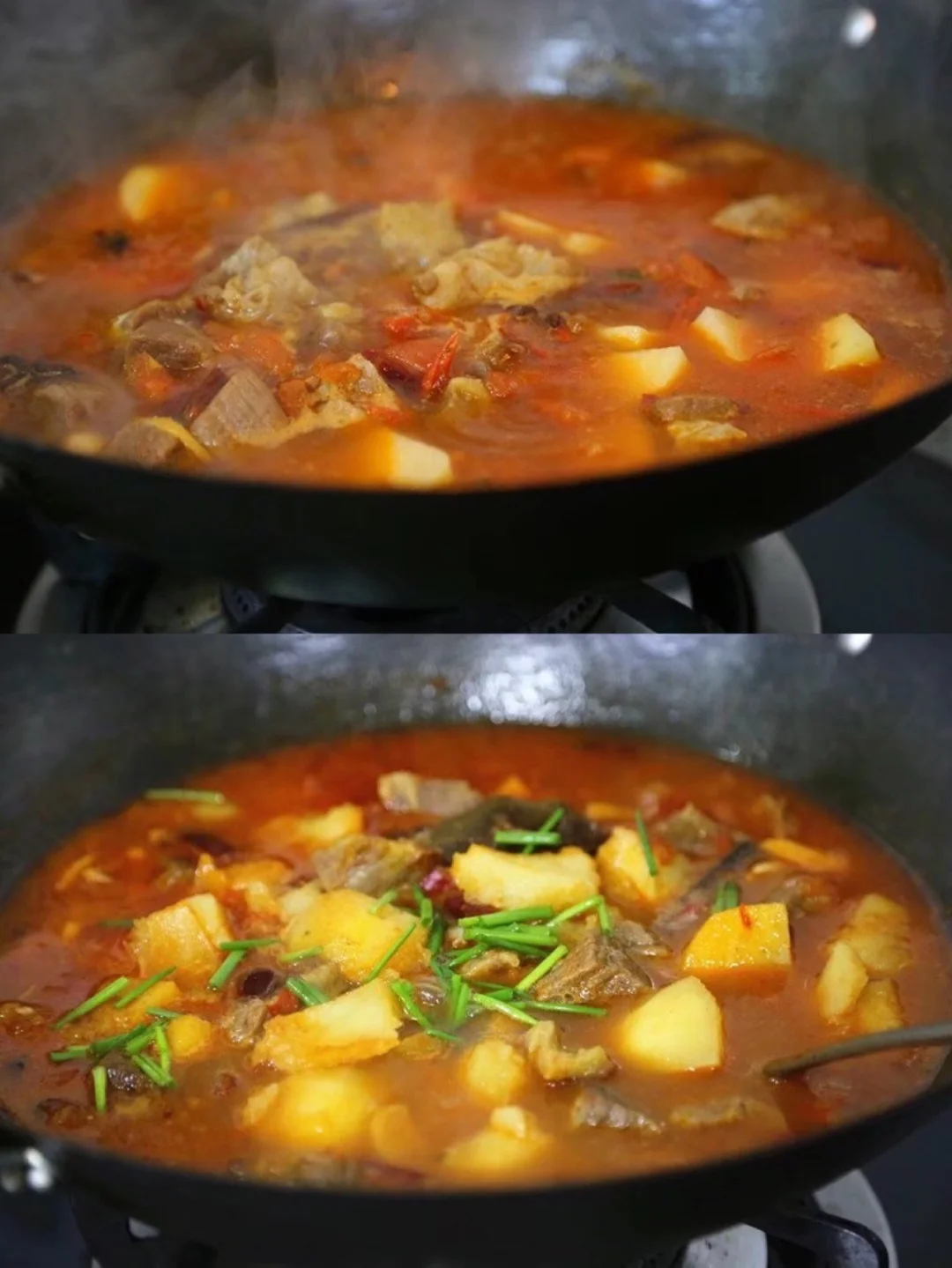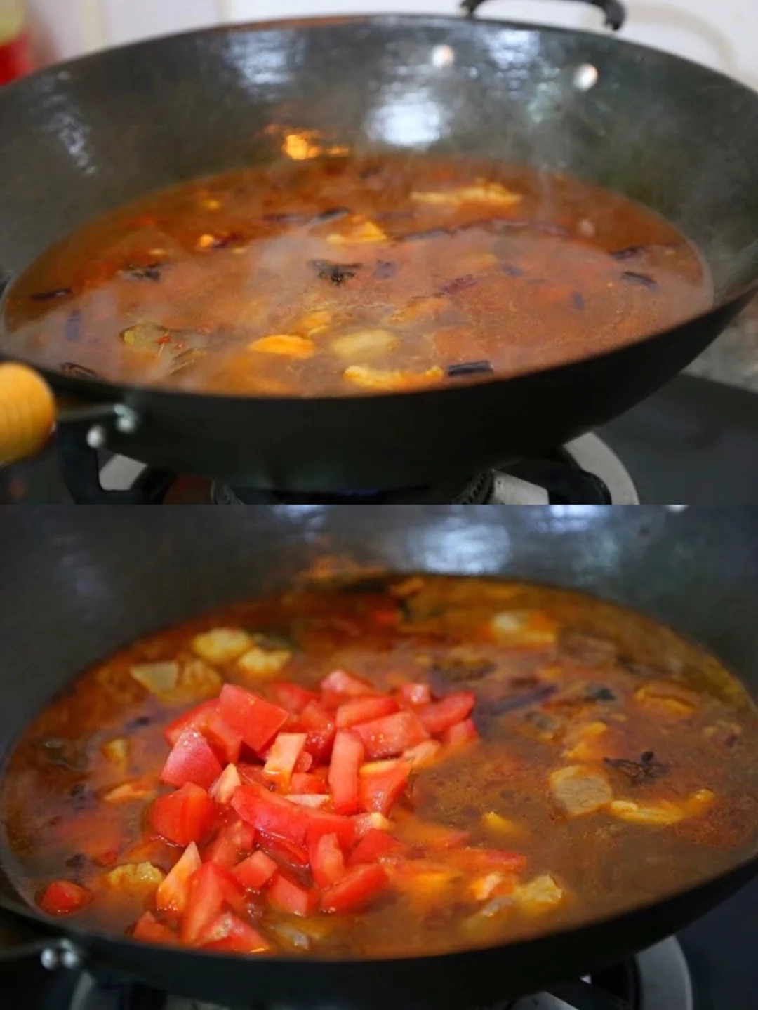 13.煮一会儿之后加入番茄块儿继续中小火慢慢煮14.加入土豆,土豆块切的大一点的早一点放 切的小的就晚一些放 不然最后全煮化了哦