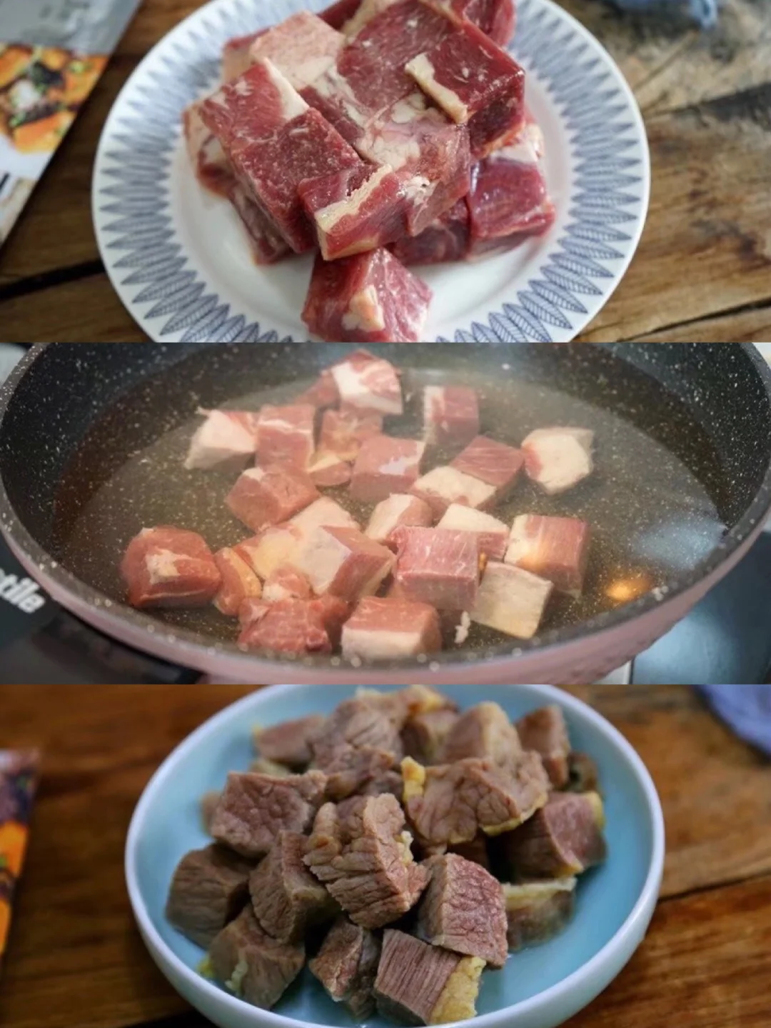 2.锅中放入适量冷水,放入牛腩块,一勺料酒煮开3.然后用温水清洗干净浮沫,沥干水待用