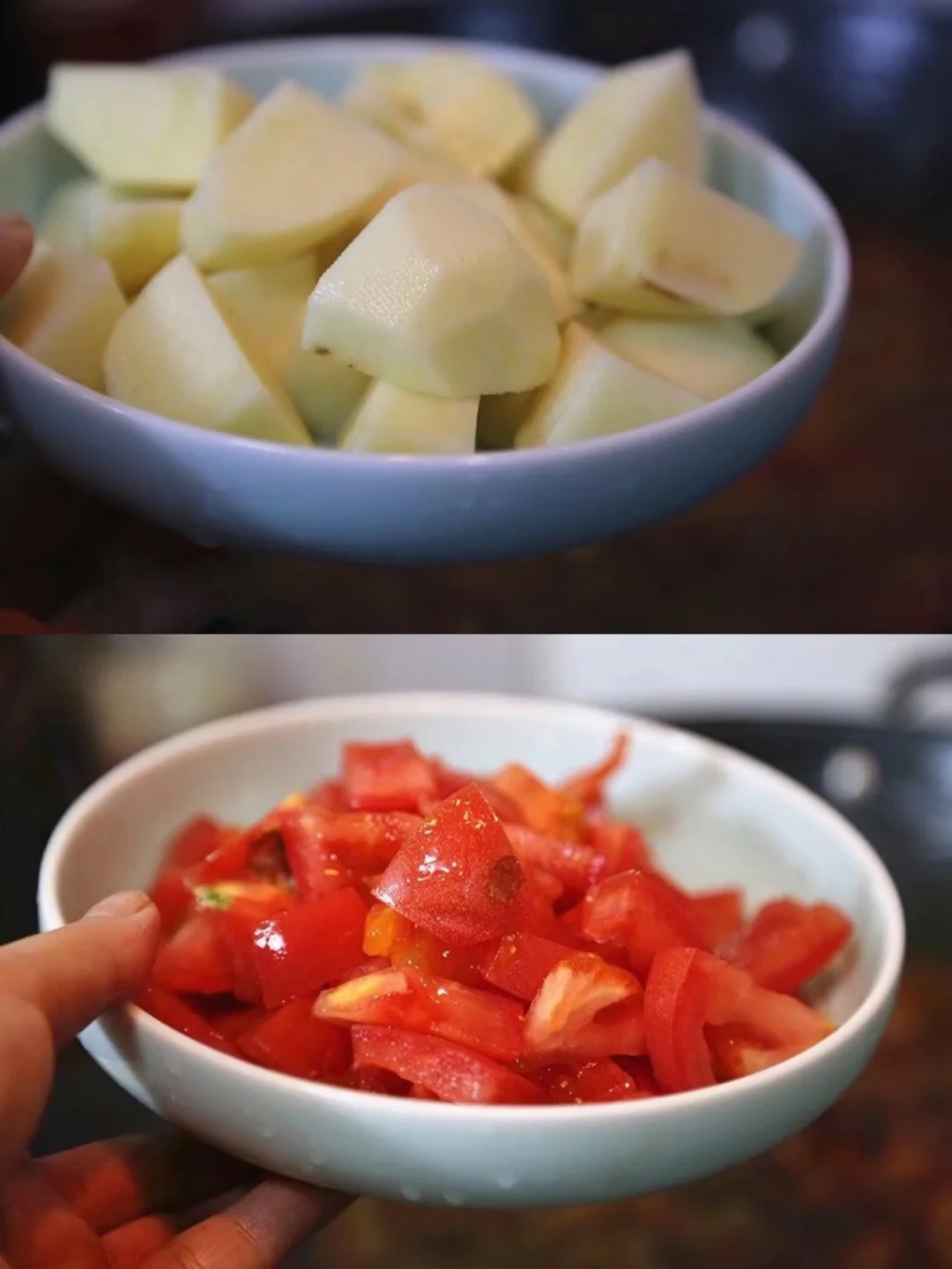 5.两个西红柿,一个切小丁,一个切稍微大一点的丁,洗净蒂不要