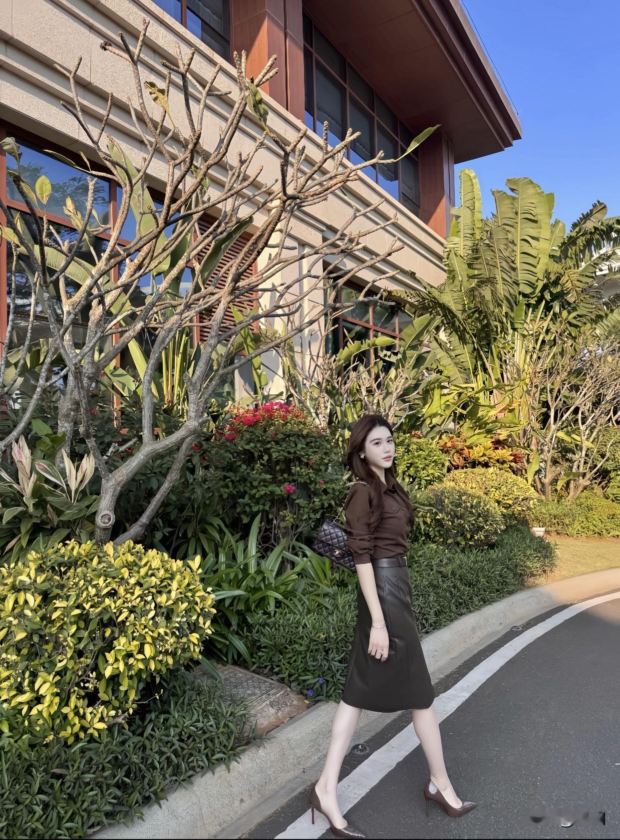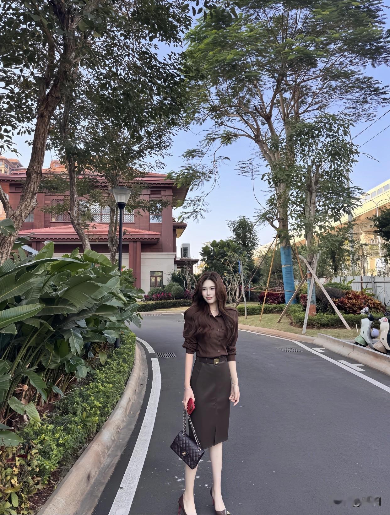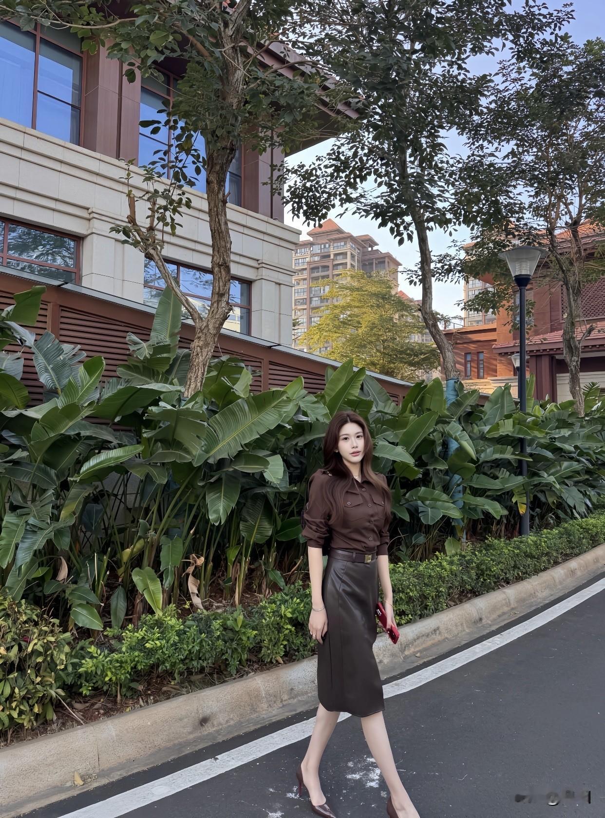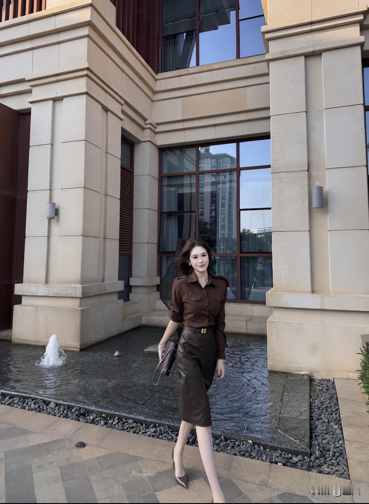 聊聊每日精选穿搭分享优雅都市风,棕色衬衫搭配黑色短裙,自信步履间尽显时尚魅力!