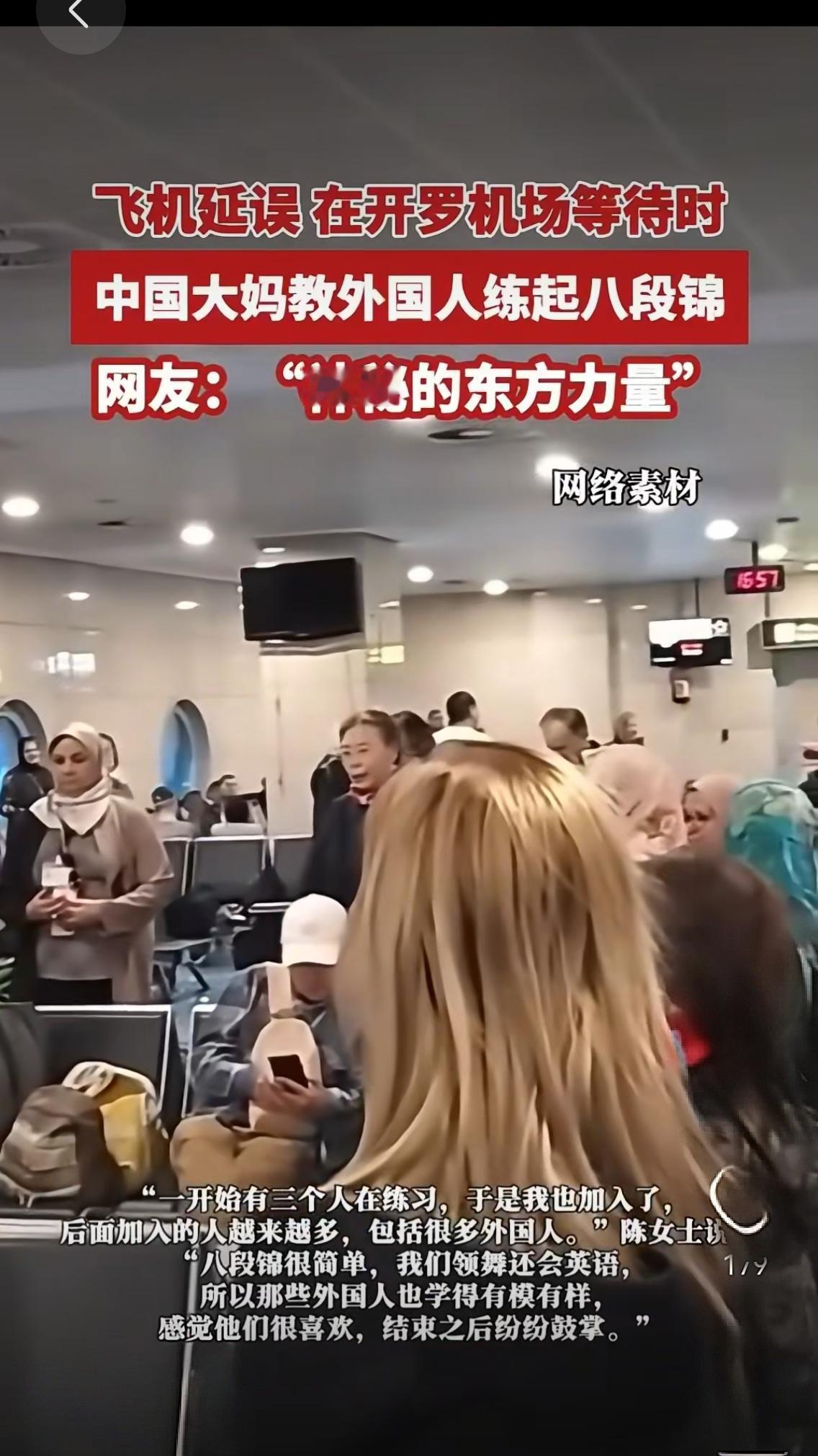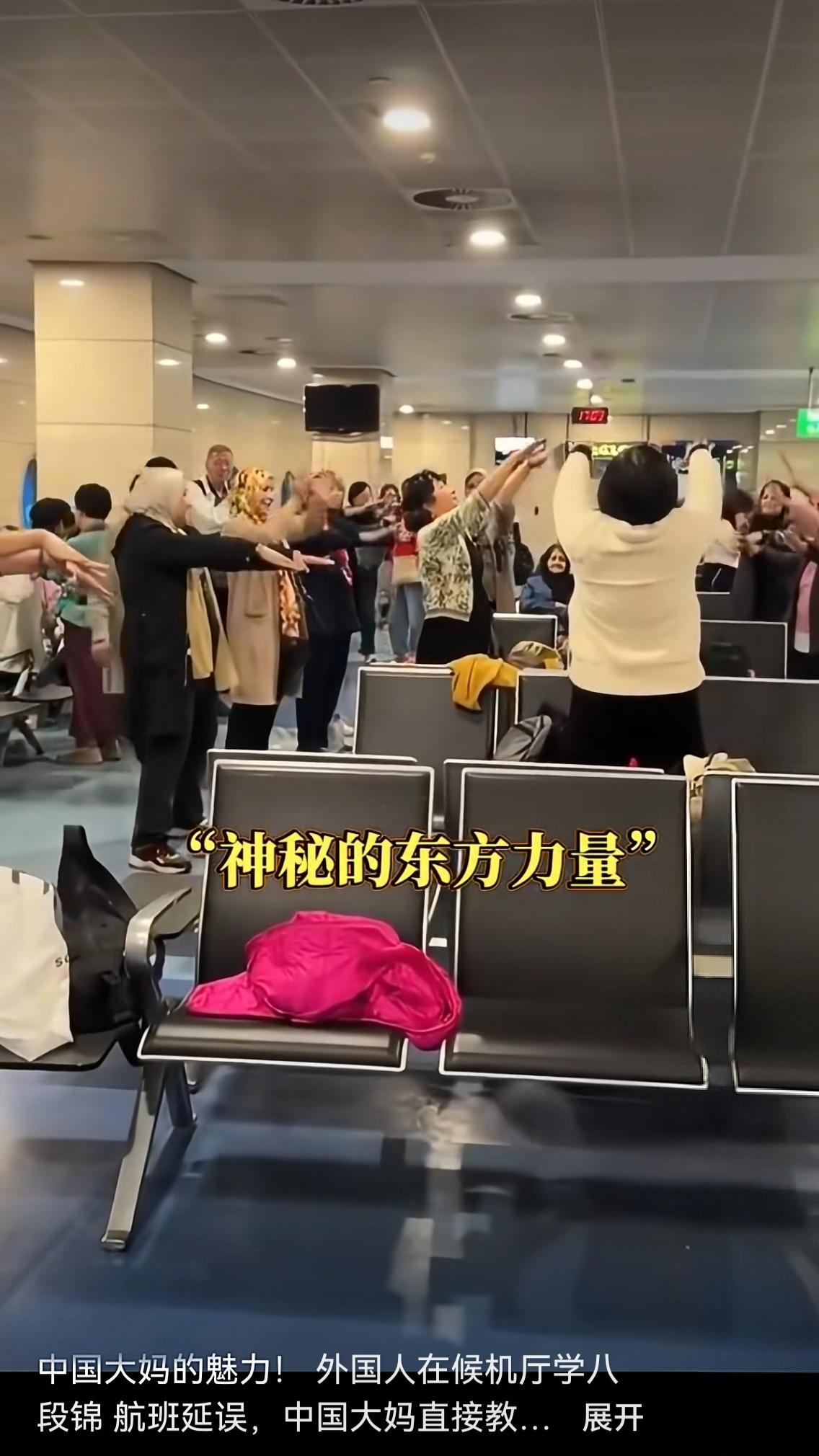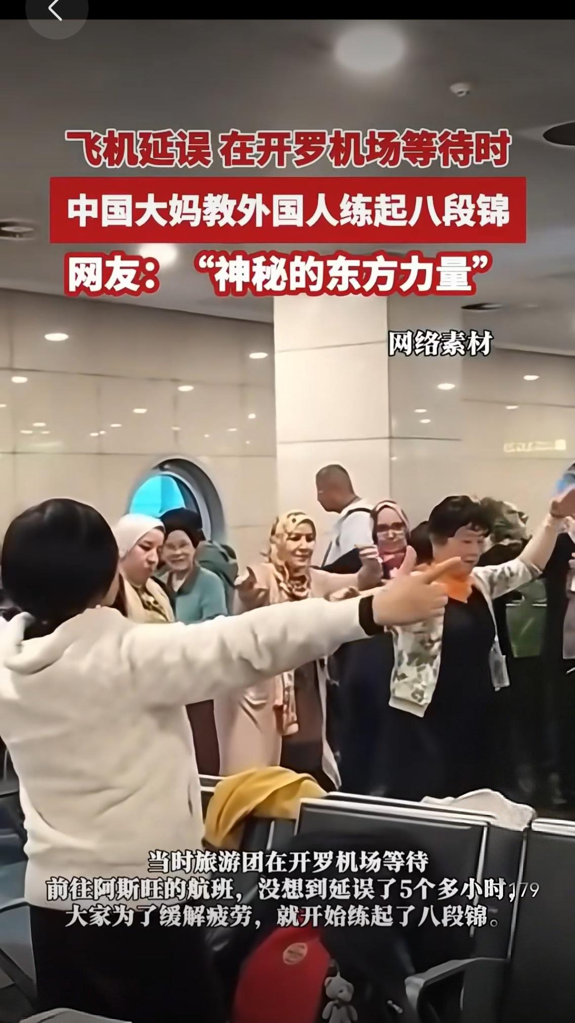 飞机延误5小时?开罗机场画风突变,中国大妈带老外练八段锦,这波文化输出太圈粉! 谁能想到,航班延误5小时的糟心时刻,竟成了最接地气的跨文化交流现场?近日埃及开罗机场,一群中国大妈用一套八段锦,让候机厅秒变“国际养生课堂”,相关视频刷爆全网,网友直呼“这就是神秘的东方力量!” 当地时间1月9日下午,中国旅游团的阿姨们本该飞往阿斯旺,却遭遇航班大面积延误。不同于其他旅客的焦躁抱怨,几位阿姨索性在候机厅开阔处练起了八段锦——毕竟这起源于北宋的传统功法,本就是缓解疲劳、调理气血的“神器”[__LINK_ICON]。起初只有三人比划,舒展的动作很快吸引了周边外国旅客的好奇目光,有人悄悄举起手机拍摄,还有人忍不住跟着抬手、转身,模仿得有模有样。 “一开始怕打扰别人,全程没敢放音乐,没想到老外学得这么认真!”参与其中的陈女士说,领舞阿姨会简单英语,一边示范“两手托天理三焦”“左右开弓似射雕”的动作,一边用口语讲解呼吸要领[__LINK_ICON]。越来越多外国人加入队伍,候机厅里挤得里三层外三层,有的挤不进核心区,就站在门口跟着比划,不少人眉头微蹙、神情严肃,仿佛在钻研一门高深学问。一套动作下来,中外旅客都微微出汗,原本因延误滋生的烦躁,竟在舒缓的肢体舒展中悄悄消散。 视频传到网上,瞬间引发百万网友热议:“老外怕是以为学了正宗中国功夫,以后能跟朋友吹嘘了”“这才是文化输出的正确打开方式,比宣传片管用一万倍”“大妈们用最朴素的方式,让世界看见东方养生智慧”。有人发现,如今在巴黎公园、纽约社区,越来越多外国人跟着练八段锦、太极拳,这些老祖宗留下的“慢运动”,正凭借低强度、高功效的优势,成为全球养生新潮流。 其实这场意外走红的背后,藏着最动人的人性密码:面对困境,中国人选择用从容代替焦虑;面对差异,用善意搭建桥梁。开罗机场的候机厅里,语言不通没关系,舒展的动作是共通的语言;文化有别也无妨,对健康的追求是人类的共识。阿姨们或许不懂“文化传播”的大道理,却用真诚耐心的教学,让外国友人感受到“慢下来感受生活”的东方哲学,这比任何刻意的宣传都更有力量。 当航班延误的糟心事,变成跨文化交流的暖心事,我们突然明白:真正的文化自信,从不是刻意炫耀,而是源于骨子里的从容与包容。一套八段锦,既解了旅途疲惫,又搭了友谊桥梁,这波“民间外交”必须满分! 你身边有过这样暖心的跨文化瞬间吗?你会练八段锦的哪些招式?欢迎在评论区分享,一起为中国大妈的“硬核软实力”点赞。机场趣闻 神秘的东方力量