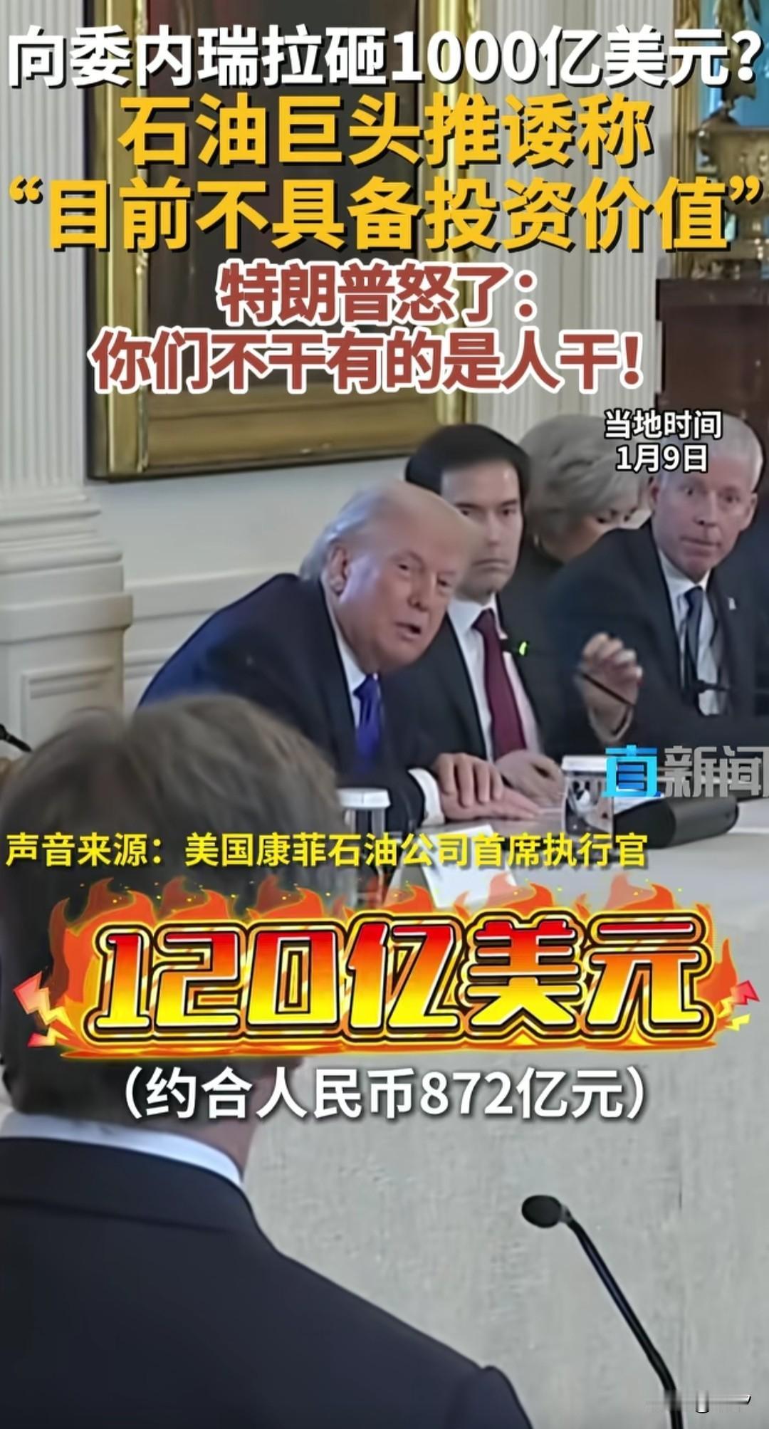 你们不干有的是人干, 特朗普被石油公司打脸! 本来费了这么大的劲劫了委内瑞拉总统,以为没有这个硬茬挡路, 美国可以从委内瑞拉获取大量石油收入,结果没有想到, 石油大亨居然摆了他一道, 人家压根不想去委内瑞拉投资石油产业,于是才出现这么尴尬的一幕, 特朗普召见了美国两大石油巨头开会, 上来为了套近乎, 就问了美国康菲石油公司执行官, 你们在那里损失了不少钱吧? 一问不知道,问了吓一跳! 人家直接损失了120亿美元, 约合人民币872亿人民币, 旁边的美孚石油公司执行官皱起了眉头,特朗普还重新问了一遍, 以为自己听错了, 结果人家又重复了一遍, 现在都响起了尴尬的笑容, 随后特朗普尴尬的回复了句, 你会有办法赚回来的, 然后问了美孚石油公司愿不愿意投资? 美孚石油公司执行官也是个人精, 还没有直接回答特朗普的话, 而是说目前而言, 委内瑞拉不具备投资价值, 这让特朗普生气了, 直接说今天召见你们, 还有25个人没有来, 他们很愿意替代你们, 言外之意就是你们不干,有的是人干! 原来美国也流行这种文化! 大家对于特朗普被石油公司驳面子这事怎么看? 美国美国打击委内瑞拉的真实动机是什么 石油公司年年亏损为什么?