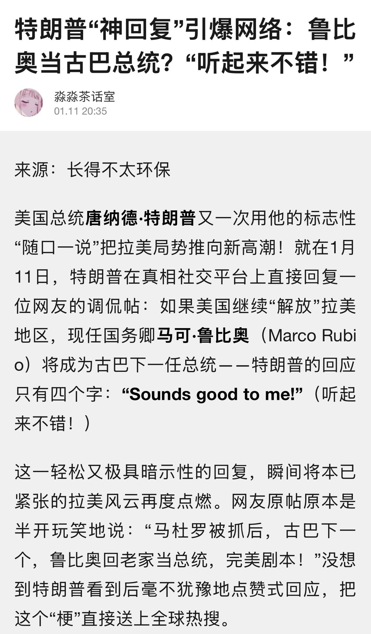 特朗普转发帖文,戏谑支持美国国务卿鲁比奥成为“古巴总统”。 古巴外长谴责美国是“罪犯和失控的霸权”,坚称“正义在古巴这一边”。 此事发生在美国在委内瑞拉采取军事行动导致美古关系极度紧张之后。 外界视此举为特朗普在敏感时期对古巴发动的政治与心理威慑。