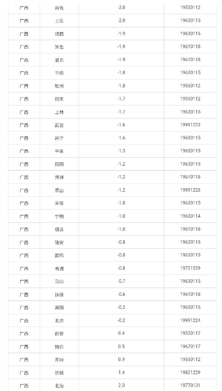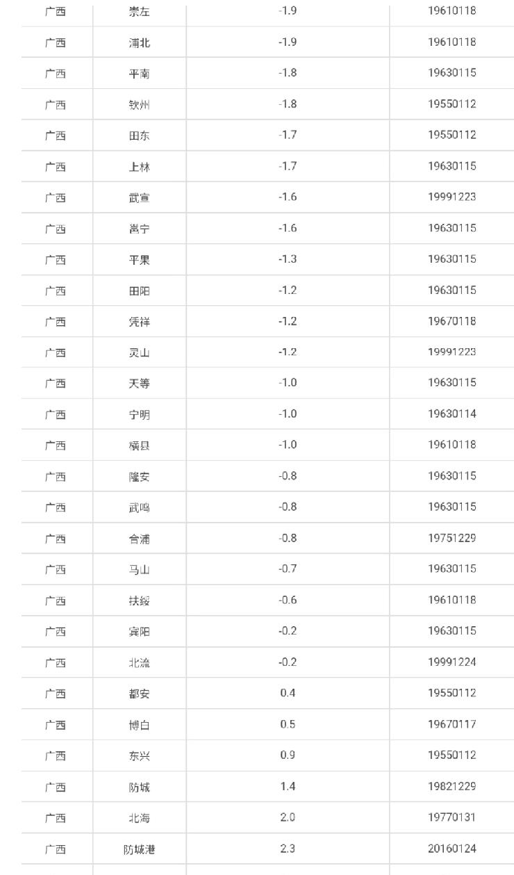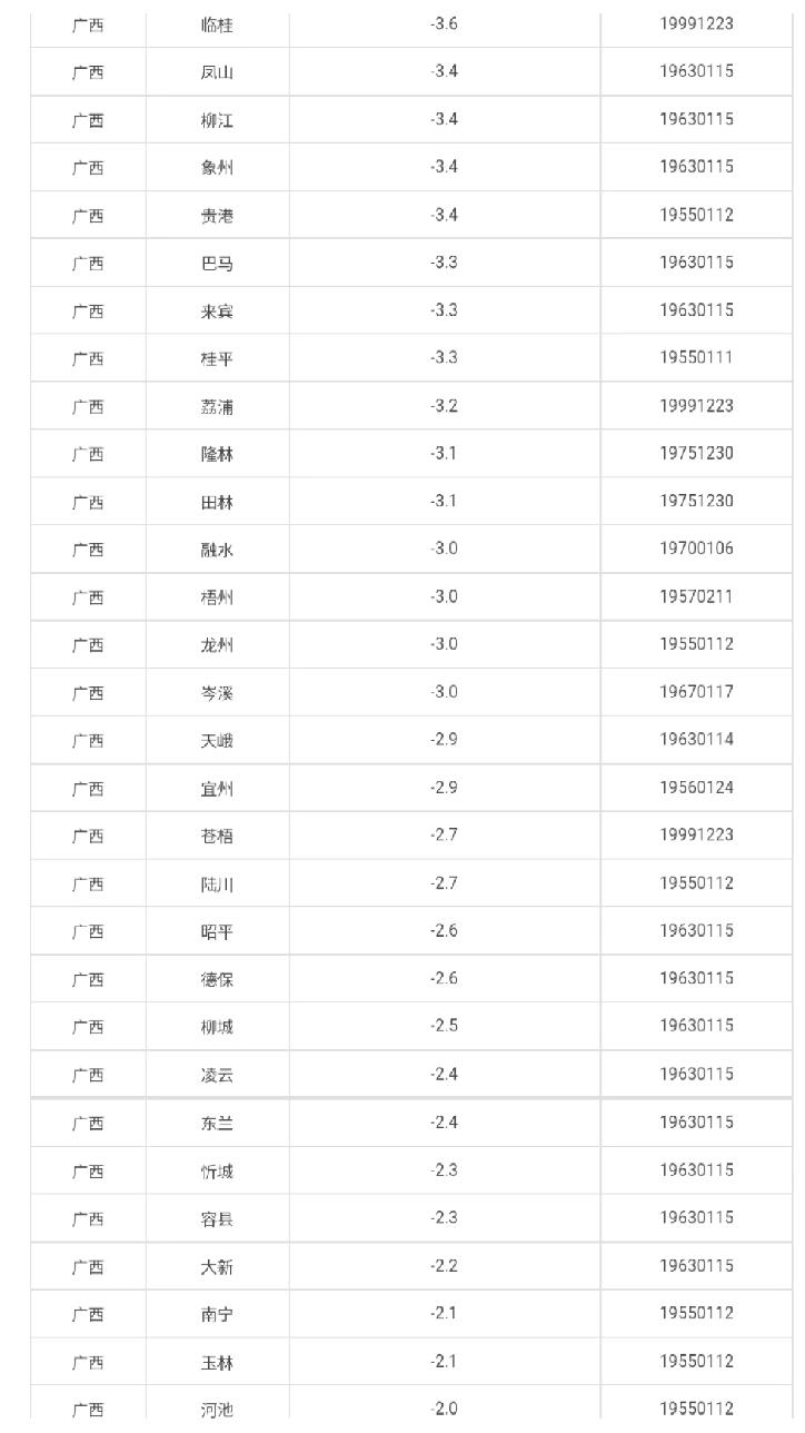 广西各地历史极端最低气温纪录列表。 仅统计经过质检的国家级气象站数据,不包括条件简陋的区域自动站、便携式温度计甚至商业化天气预报软件预测的数据。