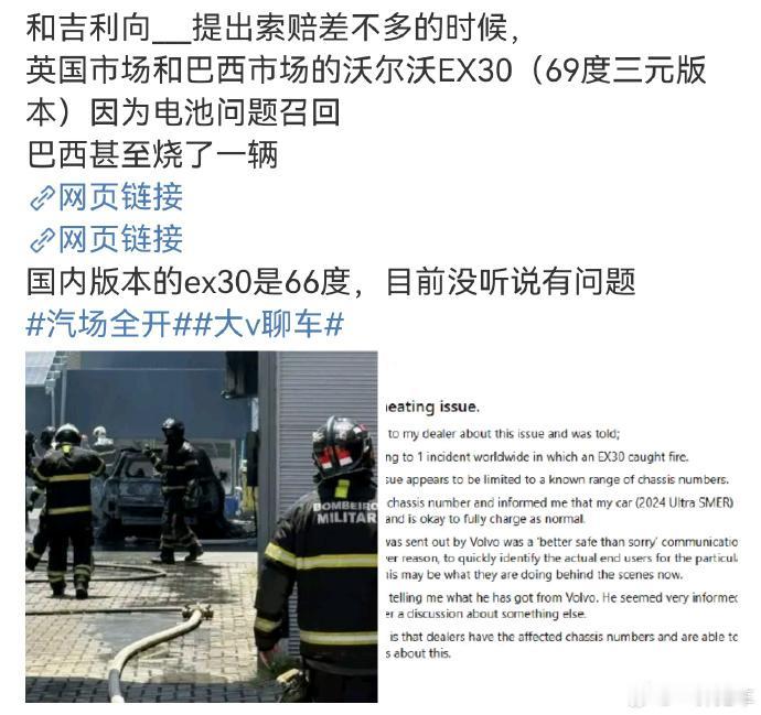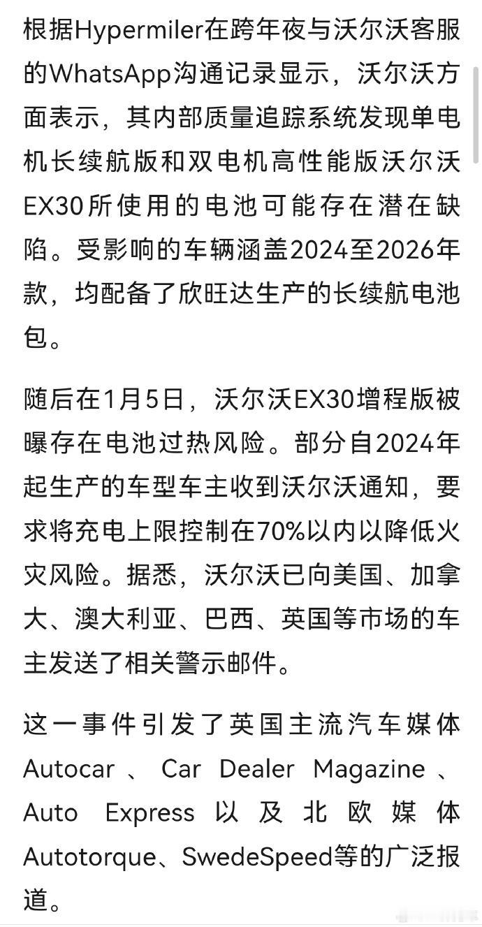 沃尔沃 EX30 海外版配的欣旺达 69 度电池出了岔子:巴西烧了一辆车,多国召回还让车主把充电上限控在 70%。国内版是 66 度电池暂没状况,但不同市场配件差异的风险得留意,欣旺达这波品控波动,也给供应链敲了警钟。