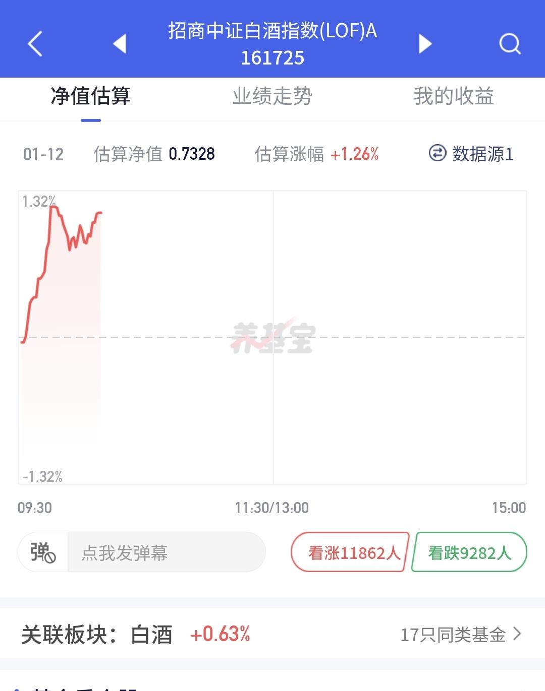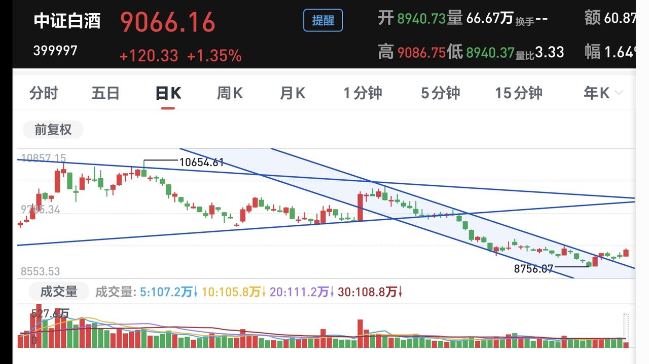 基金:白酒板块上涨,是不是已经反转 持有的基金中,白酒板块现在盘中估值是上涨,上涨了1.26%,白酒板块现在的上涨幅度为0.63%。 这个板块今天加仓排行榜见下面的截图5,持有人数排行榜见下面的截图6,排名第一的都是招商中证白酒。 我们来看一下下面的截图7,这是白酒板块日K线图,从图中可以看出,我画了两条倾斜向下的斜线,这是白酒板块日线级别短期下跌通道,上周上涨突破了这个下跌通道的上轨,现在是处于止跌状态当中,需要注意的是,这只是白酒板块日线级别短期下跌趋势被突破,也只是有可能止跌,有没有形成新的短期上涨趋势,现在还不能确定,而且,白酒板块周线级别和月线级别方向都是向下,只是日线级别的大方向也还是在向下,再观察一段时间以后,如果可以画日线级别短期上涨趋势线,我将来画出来以后,那就是我们的只有条件,现在谈论白酒板块的反转还早,连日线级别短期上涨趋势都还没有形成。 我每天都会分享我的观点,我的观点只代表我个人的看法,不能作为你操作的依据,据此操作后果自负。