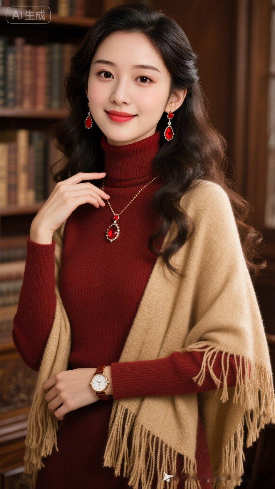 优雅红衣少女,精致耳饰,温柔微笑,梦幻AI生成