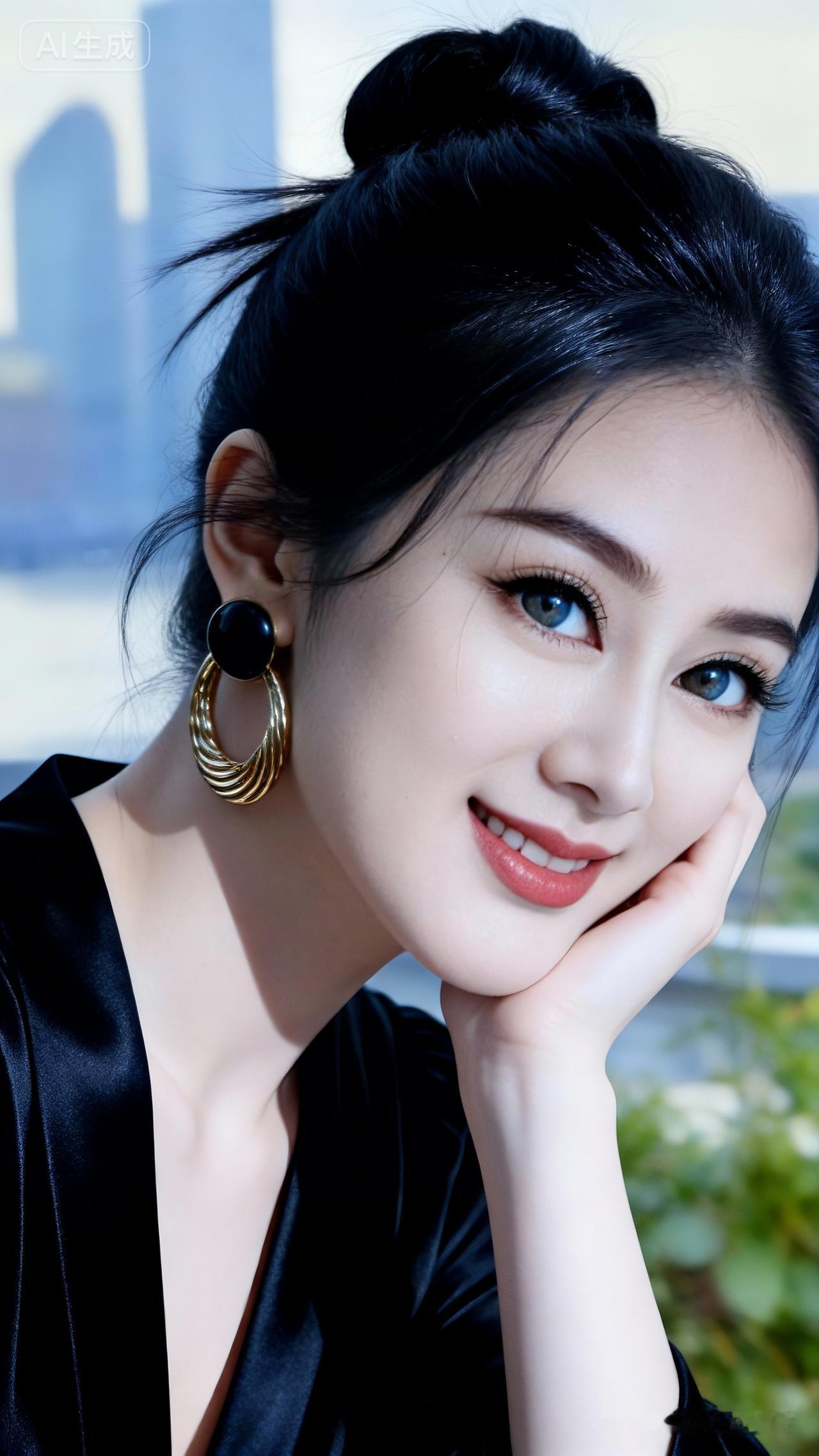 优雅黑发少女,微笑如春日暖阳,耳畔金环闪耀,尽显迷人魅力。