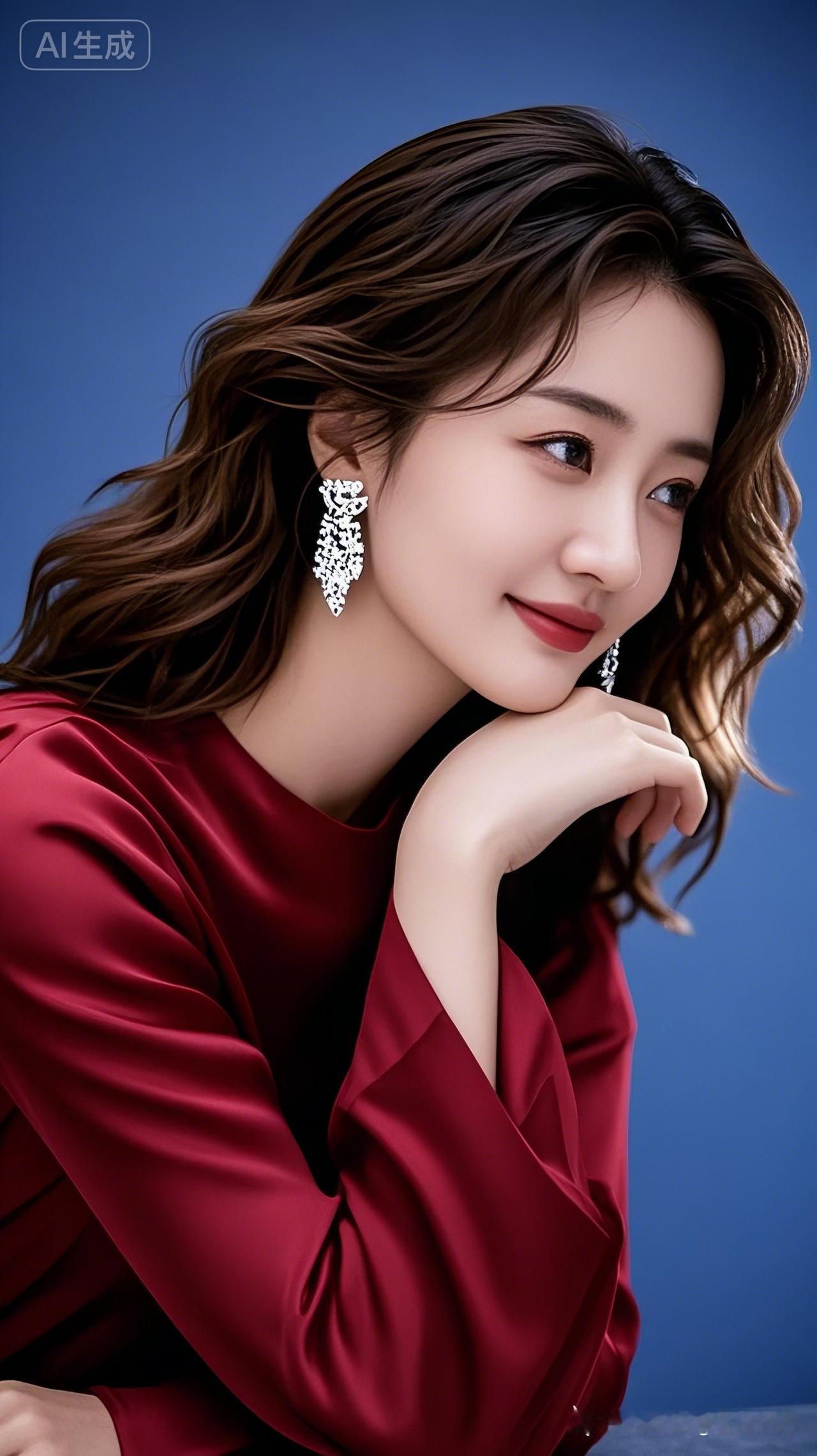 优雅红衣少女,精致耳饰,温柔微笑,梦幻AI生成