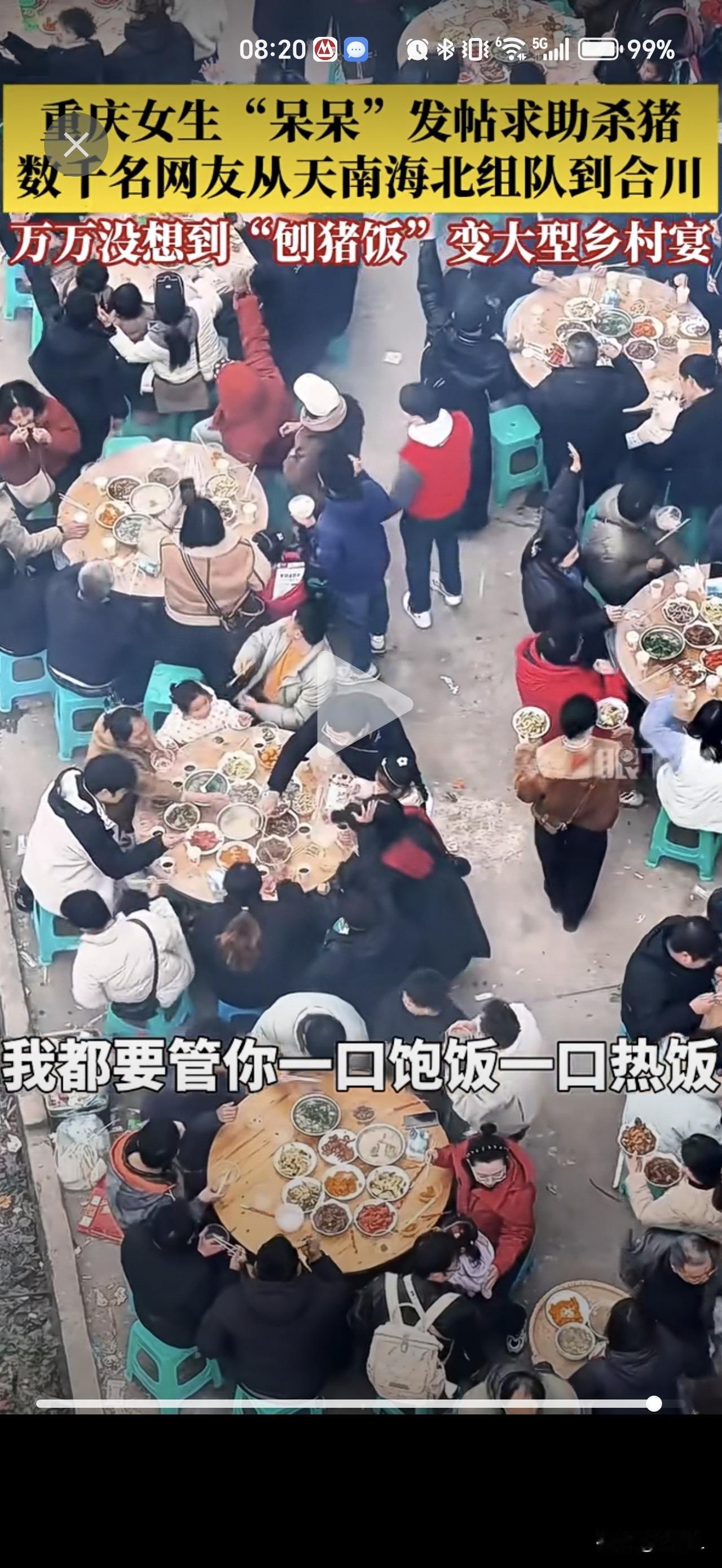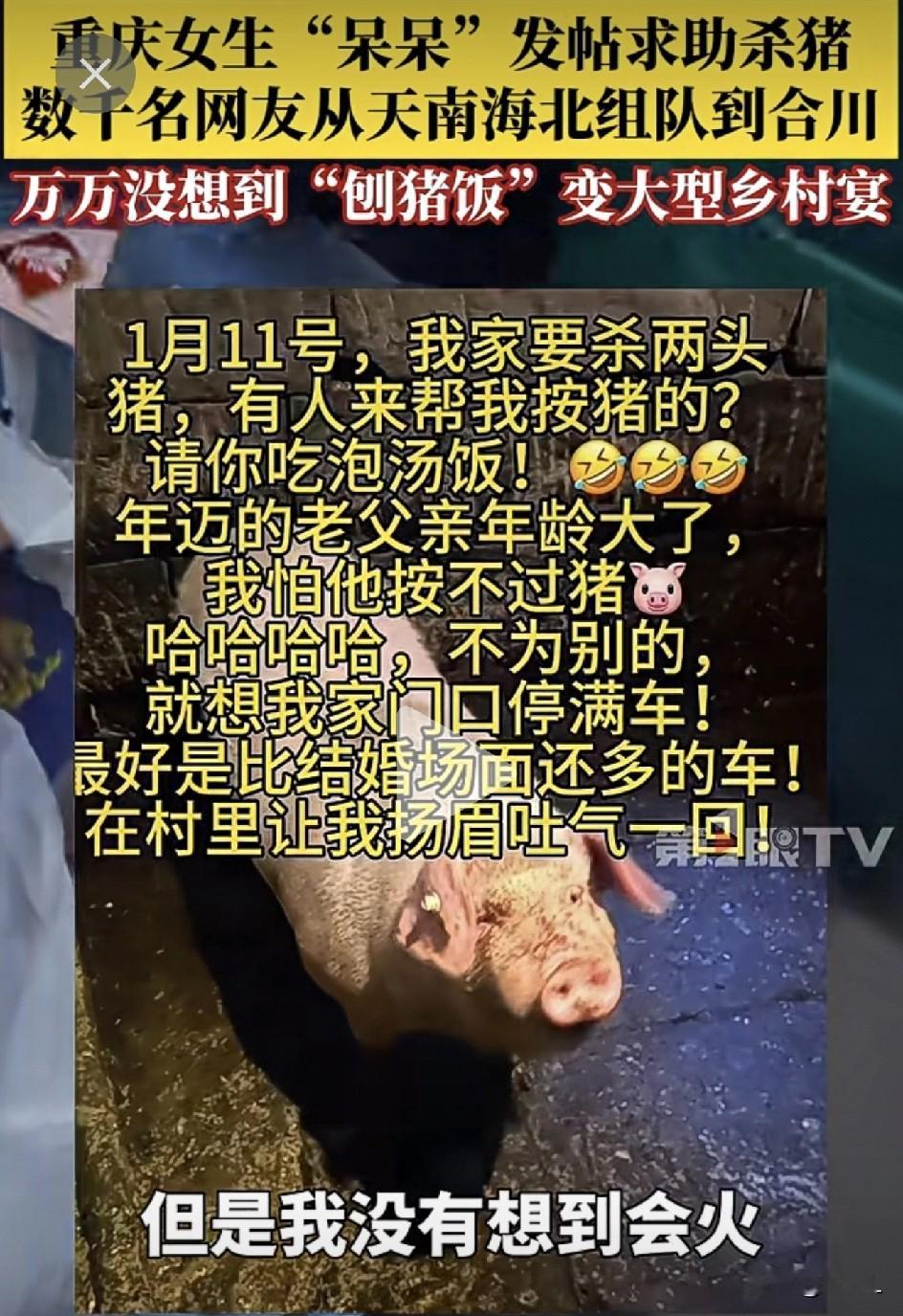 2026年第一个“闯大祸”的姑娘出现了!重庆妹子呆呆做梦都没想到,自己随手发的一条“求助帖”,竟把全村整成了大型过年现场! 1月9号凌晨,重庆妹子呆呆发视频喊话:“过两天我家杀年猪,缺人按猪!谁来帮忙,管一顿刨猪汤!” 她还偷偷透露小心思:“不为别的,就想我家门口停满车,比结婚还热闹!” 好家伙,这一嗓子直接炸锅!两天18万点赞、14万转发,5个“刨猪汤群”光速爆满! 川渝的、贵州的、广东的……全国网友连夜扛着方向盘就冲过来了! 1月11号当天,场面彻底控制不住了—— 村口车龙排了几公里,院子里挤满上千号人!有人自带碗筷,有人抢着劈柴烧火,连杀猪都不用请师傅了,全网都是“免费劳动力”! 呆呆吓得直捂脸:“我就是想凑个热闹,咋把半个中国喊来了?!” 更绝的是,官方也来“火上浇油”!合川文旅直接拍片欢迎:“回家吃刨猪汤咯!” 还现场发景区门票。派出所全员出动维持秩序,村干部紧急调配5头猪(3头是网友赞助的),院子里直接摆起流水席,从中午吃到晚上! 直播间里10万网友云吃肉,现场舞龙烟花齐上阵,连“卤鹅哥”都带着鹅赶来助兴! 网友笑疯:“这哪是杀年猪?这是全网团建吧!” 一场“按猪求助”,最终变成全村狂欢。呆呆的“排场梦”不仅实现了,还超标完成——原来大家馋的不是那口肉,是记忆里热腾腾的年味,是钢筋水泥里 missing 的那份乡野人情。 2026开年第一场“祸”,闯得真暖! 素材来源:第一眼新闻,侵联删!