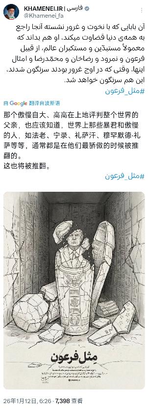 伊朗最高领袖哈梅内伊今天(北京时间1月12日)写道:“那个趾高气扬、自以为了不起地评判整个世界的家伙,应该明白像法老、尼罗德、礼萨汗、穆罕默德·礼萨以及其他那些暴君,在其极度狂妄之时都被推翻了。这个人也会如此。”哈梅内伊发布的图片展示了一尊破损的特朗普雕像位于一座埃及古墓中。 熟悉美伊关系的人都清楚,哈梅内伊口中“趾高气扬评判整个世界的家伙”,指向的正是美国前总统特朗普。 这番言论不是空穴来风的口水战,每一个被提及的名字和那张配图,都藏着伊朗对美国长期施压的强硬回应,更刻着伊朗历史与现实的双重印记。 先把哈梅内伊提到的几个关键人物说清楚,才能看懂这席话的分量。法老和尼罗德都是历史上公认的暴君代表,法老作为古埃及的专制统治者,其政权最终在社会矛盾激化中崩塌; 尼罗德则是古巴比伦时期的强权君主,以暴虐统治闻名,最终也落得政权覆灭的下场。这两个名字的出现,是哈梅内伊在从历史维度定性特朗普的行事风格。 礼萨汗和穆罕默德·礼萨这两个名字,对伊朗人来说更具现实刺痛感。礼萨汗是伊朗巴列维王朝的建立者,穆罕默德·礼萨则是这个王朝的末代国王,父子二人的统治都带着鲜明的专制色彩。 穆罕默德·礼萨推行的“白色革命”看似推动了现代化,却忽视了伊朗的宗教传统与社会结构,权贵阶层与外资勾结垄断财富,城乡差距急剧拉大,最终引发民众强烈不满。 1979年,伊朗伊斯兰革命爆发,穆罕默德·礼萨被迫流亡,巴列维王朝彻底覆灭,而美国曾是这个专制王朝的重要支持者。 哈梅内伊特意把这四位放在一起,核心逻辑很明确:历史上所有妄图凭借强权掌控一切、漠视民众意愿的暴君,无论曾经多不可一世,最终都会被推翻。他将特朗普与这些人并列,本质上是在批判特朗普政府对伊朗的长期遏制与打压政策。 回顾近年来的美伊互动,双方的矛盾早已深入多个领域。2018年,特朗普政府单方面退出伊朗核协议,重启并加码对伊制裁,直接导致伊朗经济陷入困境,货币贬值、物价上涨等问题持续困扰伊朗民众。 2020年,美军在伊拉克发动空袭,刺杀伊朗头号军事指挥官卡西姆·苏莱曼尼,这一行为彻底激化了美伊矛盾,伊朗当时就明确表态将展开复仇。 近期伊朗国内出现的部分骚乱,成为双方矛盾的又一导火索。伊朗方面多次指责美国和以色列是骚乱的幕后黑手,认为这些势力在暗中煽动民众,试图破坏伊朗的社会稳定。 哈梅内伊此前就曾公开喊话,称特朗普的双手沾有伊朗人的鲜血,却还虚伪地自称是“伊朗人民的支持者”。 那张破损的特朗普雕像置于埃及古墓的配图,更是把这种批判具象化。埃及古墓本就是历史的见证,破损的雕像则直接隐喻了特朗普的结局——如同那些尘封在历史中的暴君,最终只会落得身败名裂的下场。这张图不是简单的情绪宣泄,而是伊朗对美国强权政策的公开蔑视。 哈梅内伊的这番言论,也是在向伊朗国内传递团结信号。当前伊朗正面临经济与社会的双重压力,哈梅内伊希望通过强调“暴君必亡”的历史规律,凝聚国内共识,让民众认清外部势力的真实目的,避免被外部煽动裹挟。他此前就曾呼吁伊朗人民保持团结,称“只要团结就能战胜敌人”。 从国际局势来看,这番表态也让本就紧张的美伊关系再度升温。特朗普近期的对伊相关言论,被伊朗解读为对其内政的干涉,哈梅内伊的回应算是对这种干涉的直接反击。 不过需要明确的是,伊朗的态度虽强硬,但并非寻求战争,哈梅内伊此前就曾强调,伊朗不寻求战争,但如果有人主动挑衅,伊朗的反击会果断且坚决。 说到底,哈梅内伊的这番话和配图,是历史警示与现实批判的结合。他用伊朗人熟知的历史人物与事件,向特朗普传递清晰信号:强权政治行不通,干涉他国内政终将自食恶果。而这背后,是美伊多年积累的矛盾,也是伊朗在压力下坚守自身立场的明确表态。 后续美伊双方是否会有进一步的互动,仍需持续关注,但可以肯定的是,历史规律的警示,从来都值得所有强权者深思。