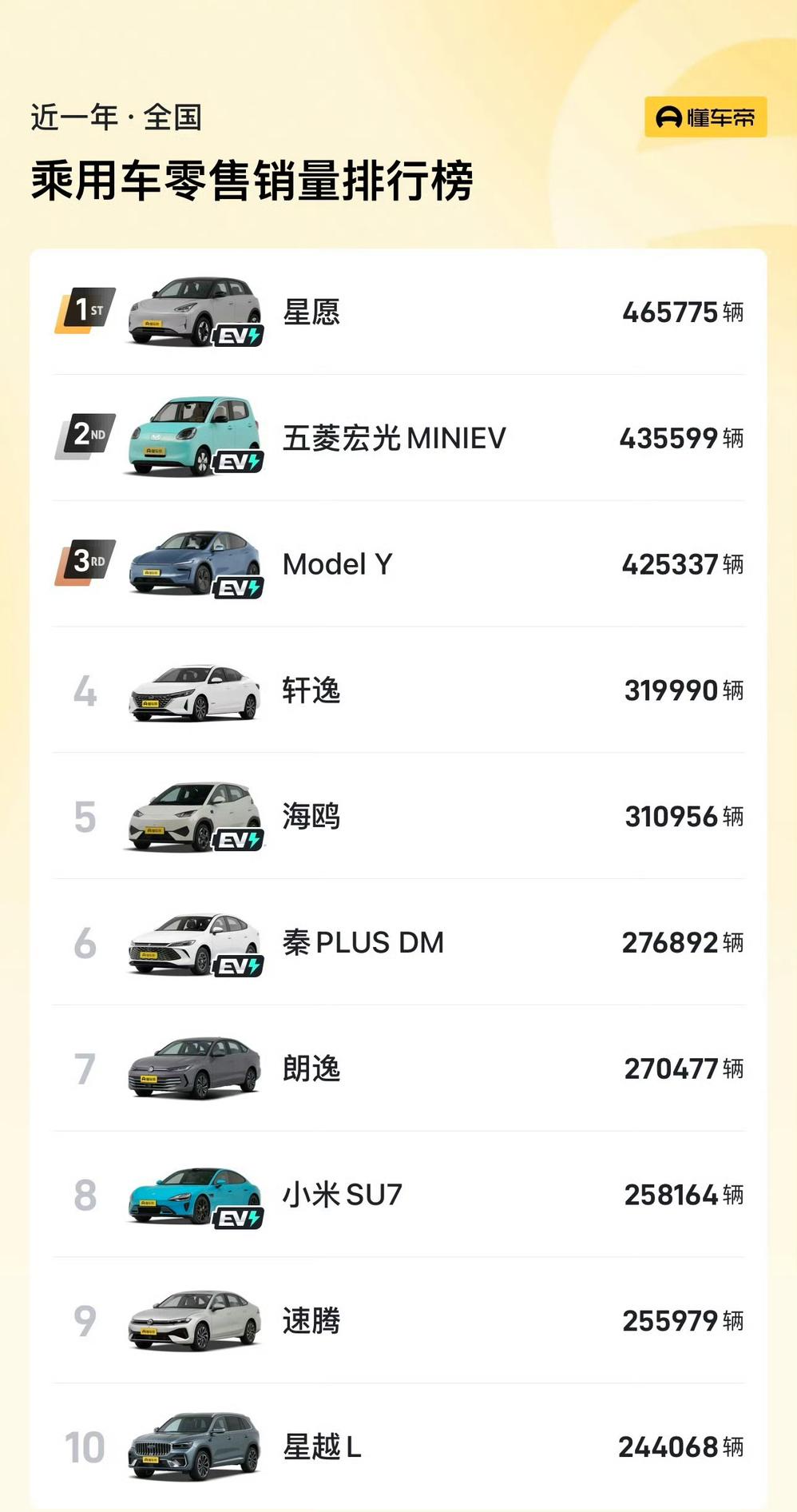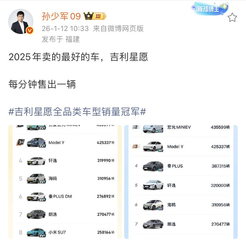 孙少军:2025年卖的最好的车,吉利星愿,每分钟售出一辆! 这种续航低、价格低的小车深受消费者的喜爱,主要使用场景,也就是周边使用一下,接接小孩,买买菜,上下班代步等。 五菱宏光mini ev也是这种车型,所以这款车型是去年销量榜第二,消费者对于廉价小车有巨大的需求,比亚迪的海鸥也榜上有名。 各位是怎么看的?欢迎评论区留言。