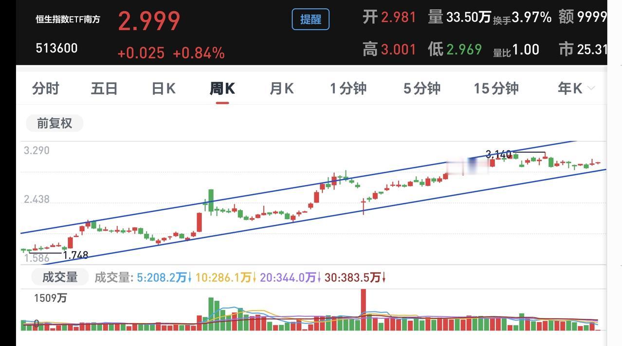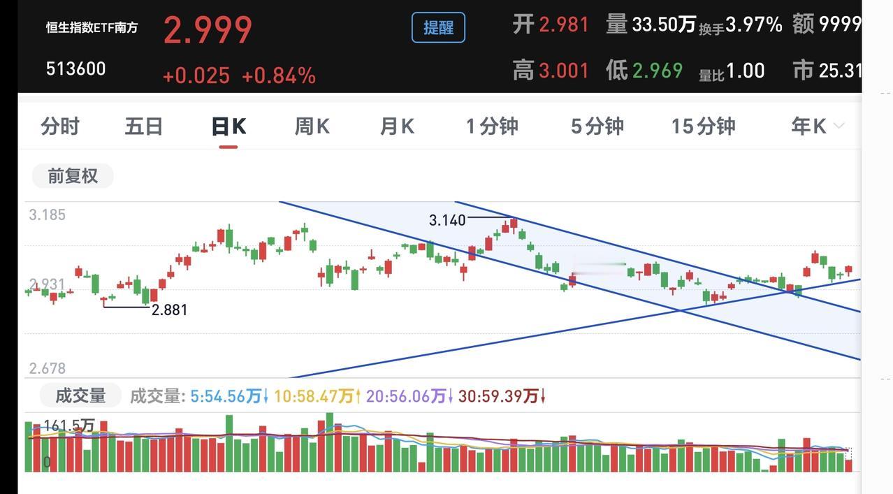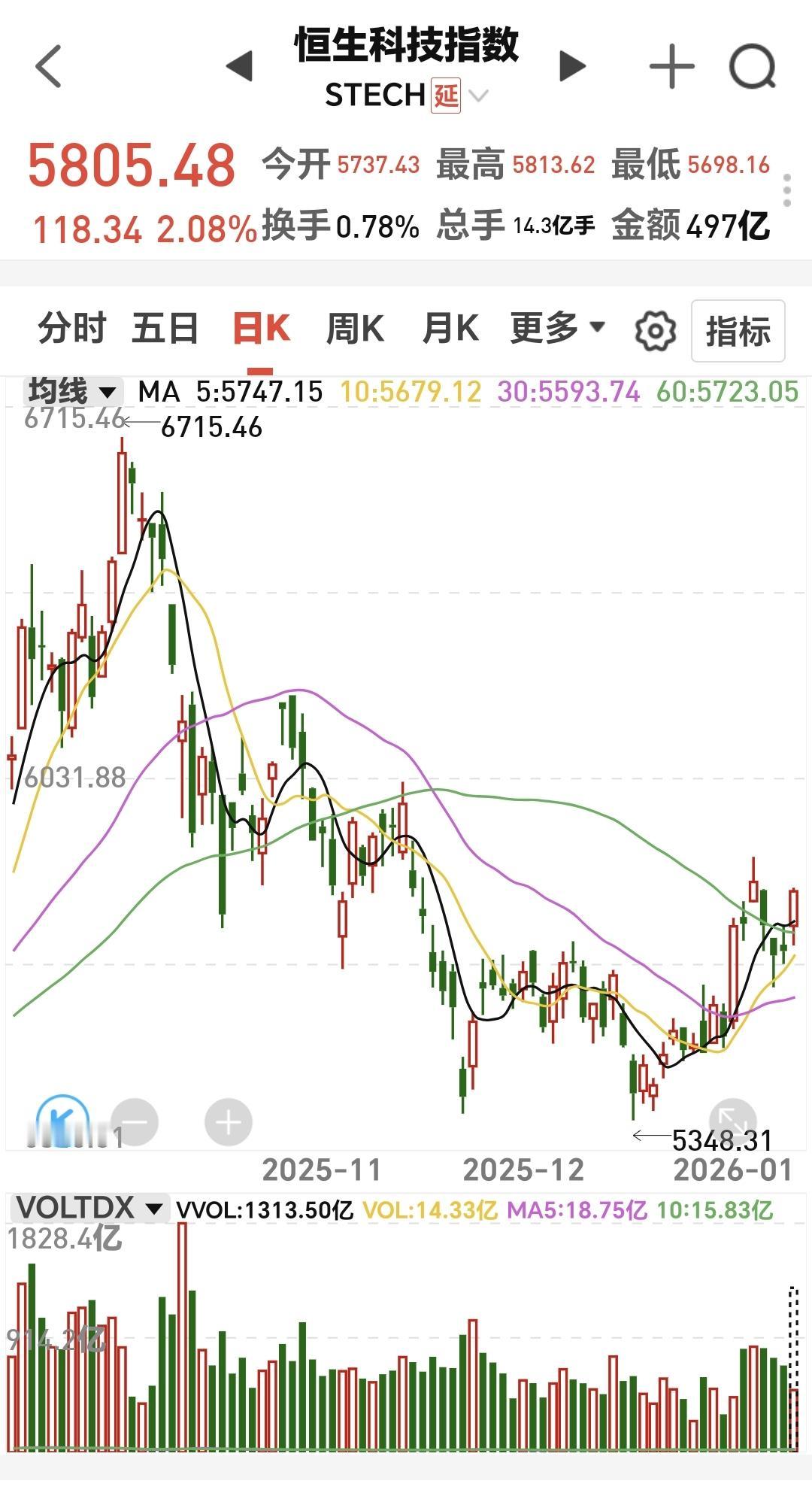 基金:恒生科技板块应该怎么办 香港市场今天上涨,恒生指数上涨了0.77%,国企指数上涨了1%,恒生科技指数上涨了2.14%。 我们来看一下下面的截图3,这是恒生科技指数日K线图,从图中可以看出,最近是在走震荡走势,今天又站上了5天线,现在5天线的位置是5747点,盘中点位为5805点,站在5天线之上,近期还是观察5天线的得失。 我们来看一下下面的截图4,这是恒生科技板块日K线图,从图中可以看出,我画了两条倾斜向下的斜线,这是恒生科技板块日线级别下跌通道。前段时间上涨突破了这条下跌通道的上轨,然后我又画了一条日线级别短期上涨趋势线,现在的位置处于这条上涨趋势线的上方,短线持有的人可以继续持有,除非跌破这条上涨趋势线,才可以考虑要不要止盈出来观望。 我们来看一下下面的截图5,这是恒生科技板块周K线图,从图中可以看出,我画了两条倾斜向上的斜线,这是恒生科技板块周线级别上涨通道,现在的位置处于这个上涨通道内,也就是说,恒生科技板块周线级别处于上涨趋势中,长线持有的人可以继续持有,除非跌破这个上涨通道的下轨,才可以考虑要不要止盈出来观望。 我每天都会分享我的观点,我的观点只代表我个人的看法,不能作为你操作的依据,据此操作后果自负。