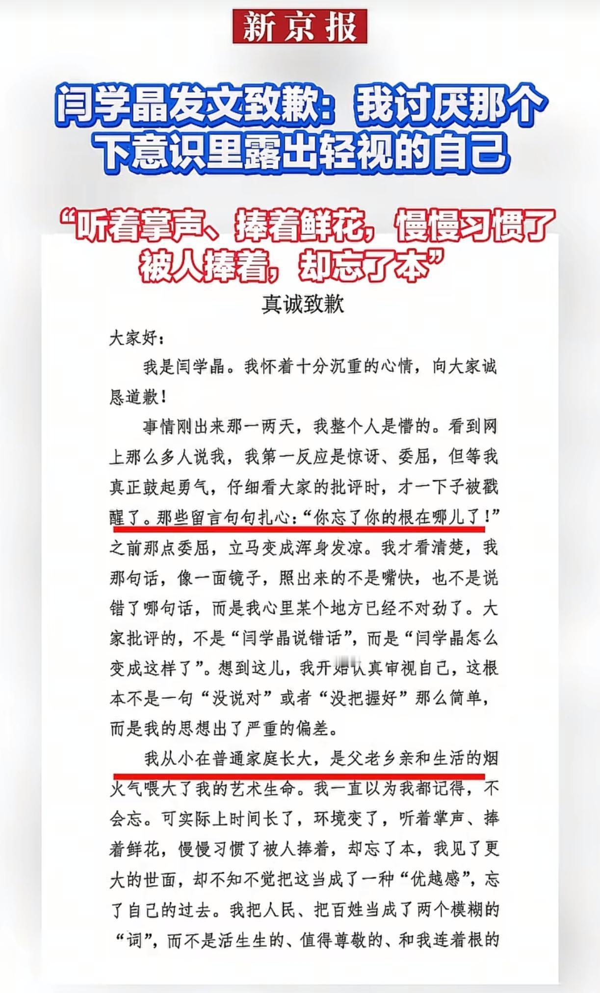闫学晶这个时候才想着道歉,已经晚了! 要是品牌方没有选择和她解约,平台没有封禁她,那她还会为自己的言论道歉吗? 不好说,但她选择在品牌方解约和平台封禁后再发文道歉,她也许不是真的知道错了,可能是害怕了。 在她还能代言,还可以直播带货时都哭穷了,现在经济来源都断了,她不慌才怪。 检验书谁都写过,但写归写,服不服只有自己才清楚,想起我们读书时写的检讨书,交上去后还不是照样犯同样的错误。 并不是网友想找她茬,如果在舆论发酵之前,她就诚恳的道歉,事情也不至于闹到这种地步,现如今,她要想挽回,那就只有告别直播,回老家种地,彻底回归老百姓的平凡日子。