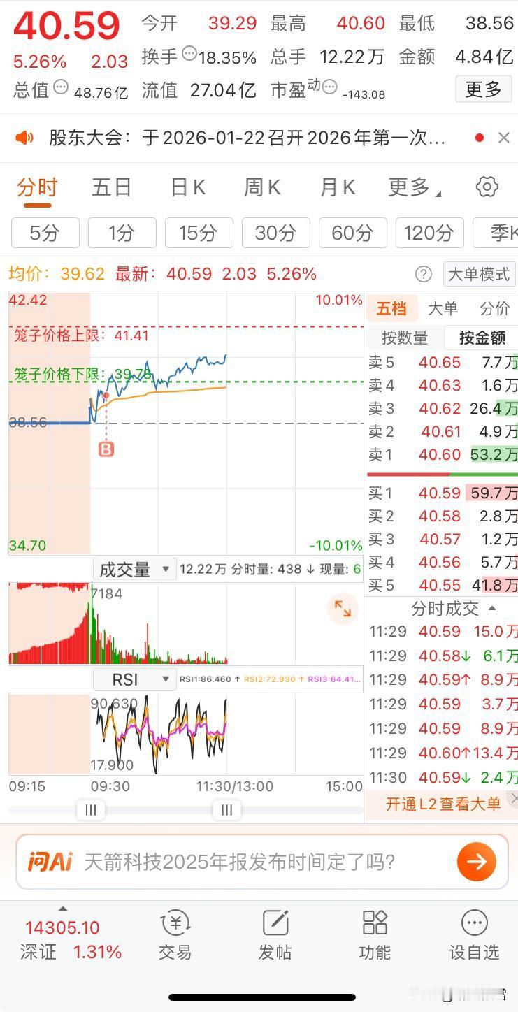 1月12日午盘 沪指主力一致,今天顺势高开,下午继续高走! 两市成交额已达23326亿,较前一日同期放量2505亿,增幅12.03%,预测全天成交34031亿,远超近60日均值。上涨家数3804家,下跌1504家,超1950只个股涨5%-1%,市场情绪亢奋,量价齐升。 以下持续性主线(一日游放弃) 核心主线:商业航天 次主线:人工智能及应用、芯片、数据 前排:阿里、腾讯概念 个人主线:商业航天(底部挖金)