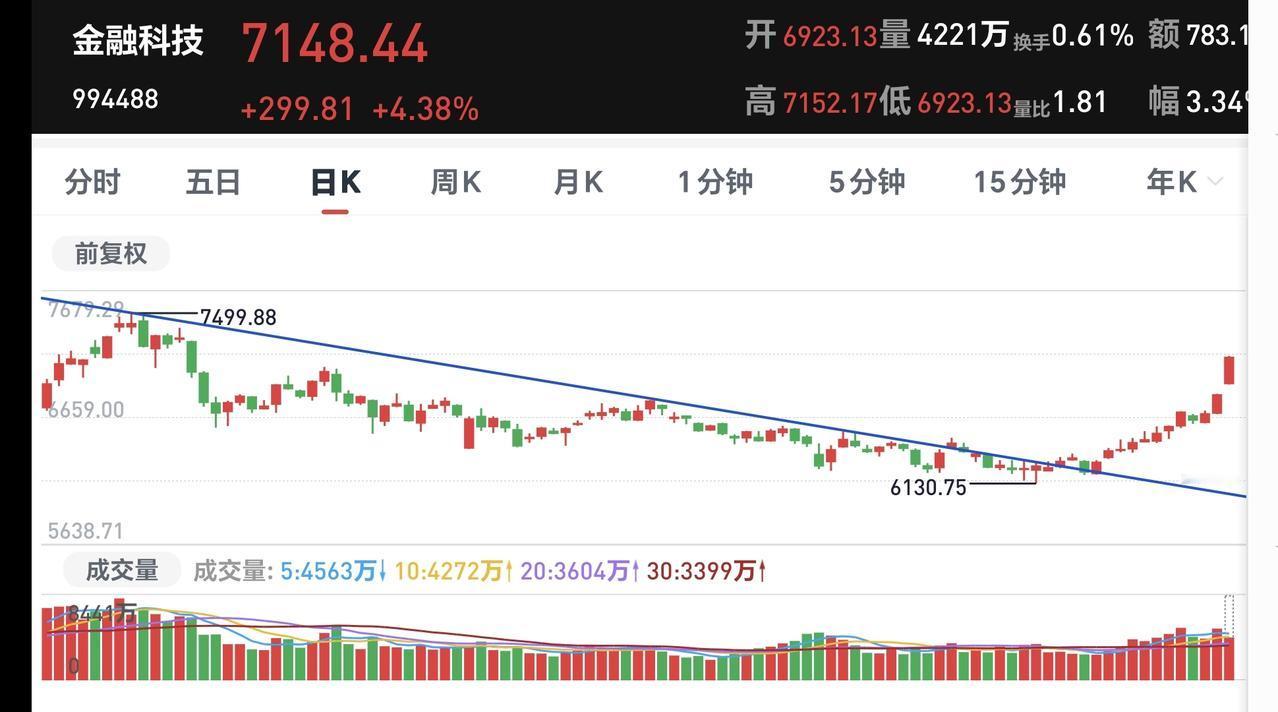 基金:金融科技板块应该怎么办 今天板块上涨幅度6%以上的有2个,上涨幅度5%以上的有1个,上涨幅度,4%以上的有4个,金融科技板块上涨幅度超过了4%,是连续第2个交易日上涨,持有人数排名第48位。 这个板块今天加仓排行榜见下面的截图3,持有人数排行榜见下面的截图4,加仓人数最多的是博时中证金融科技主题,持有人数最多的是华宝中证金融科技主题。 我们来看一下下面的截图5,这是金融科技板块日K线图,从图中可以看出,我画了一条倾斜向下的斜线,这是金融科技板块日线级别下跌趋势线。前段时间上涨突破了这条下跌趋势线,然后是一路上涨到现在。 我们来看一下下面的截图6,这是金融科技板块周K线图,从图中可以看出,我画了两条倾斜向上的斜线,这是金融科技板块周线级别上涨通道,现在的位置处于这个上涨通道内,也就是说,金融科技板块周线级别处于上涨趋势中,持有的人可以继续持有,除非跌破这个上涨通道的下轨,才可以考虑要不要止盈出来观望。 我每天都会分享我的观点,我的观点只代表我个人的看法,不能作为你操作的依据,据此操作后果自负。